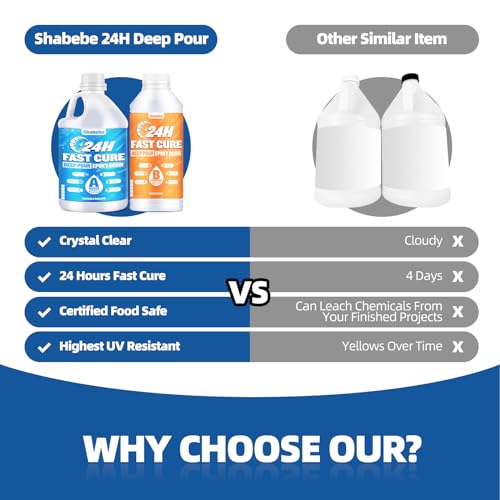 - 24H DEEP POUR EPOXY RESIN FAST CURE: Shabebe 24-hour deep pour epoxy resin 1-2 inch fast cure boasts an enhanced formula that significantly accelerates project completion without compromising product performance. Witness the transformation with our cutting-edge deep-pour epoxy and its 24-hour rapid cure technology!
