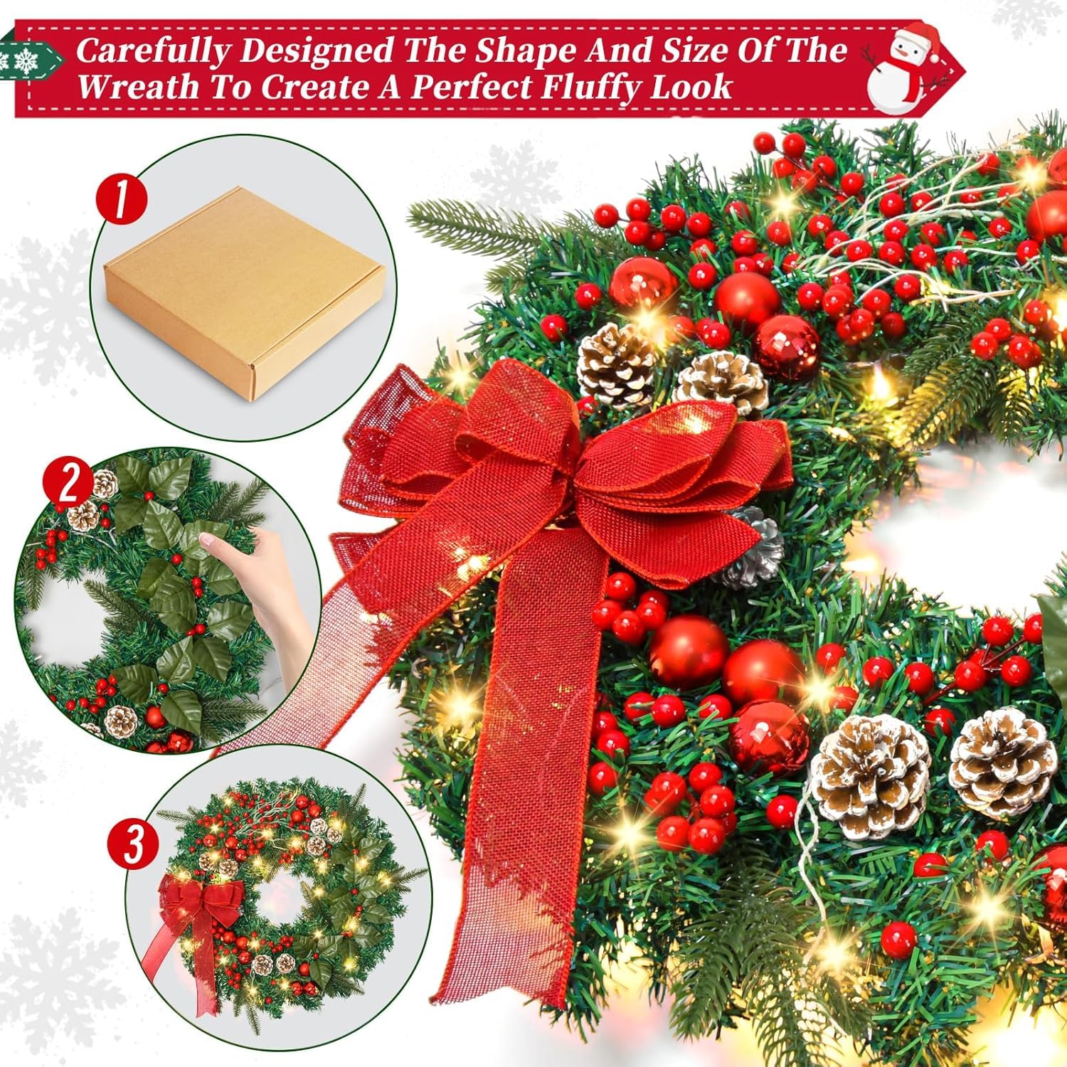- 【Superior Craftsmanship】 Handcrafted with care, our Christmas wreath is designed using advanced techniques to keep decorations secure. This ensures vibrant colors and an attractive look for years. For the best presentation, gently fluff the branches upon unpacking.