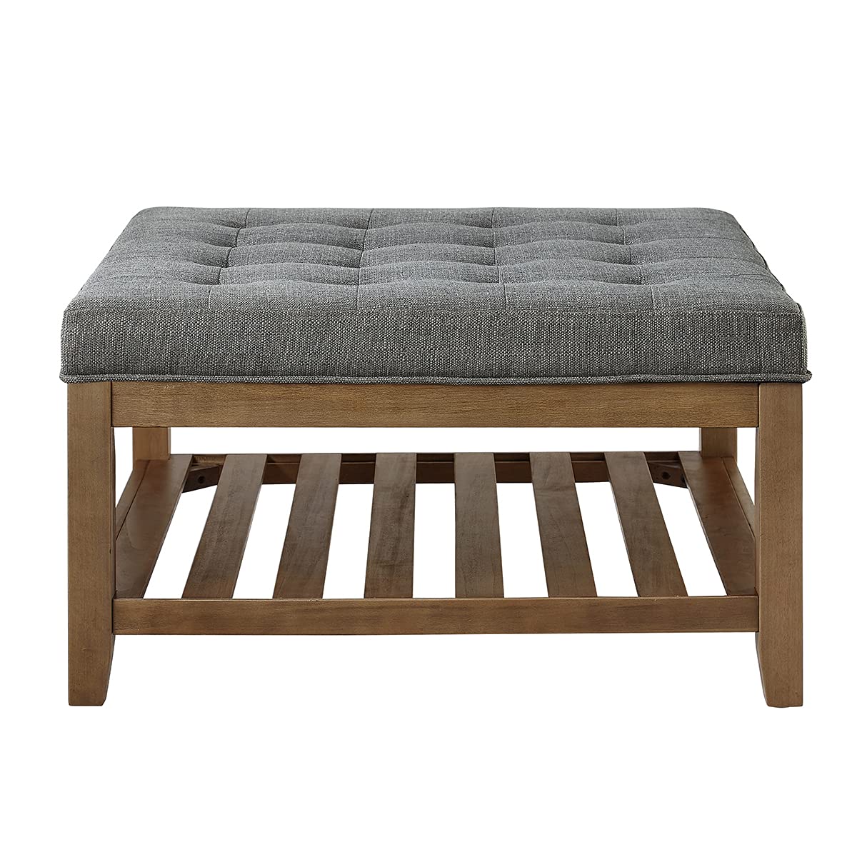 Details: 1. Simplistic lines pulling from the craftsman era and tapered legs to add some style, the tufted coffee table with wooden shelf can easily compliment any home styling décor. The added Width of the Bottom slats serves as a function shelf. There are 5 fabric colors offered: Ivory, Charcoal, Granite, Linen, Navy Blue 2. Embedded solid wood supports heavy capacity and longer use. Material : Solid wood fram+TB117 Foam+ Linen fabric+ Metal ; Product Size: 33.5”L X 33.5"W X 18”H