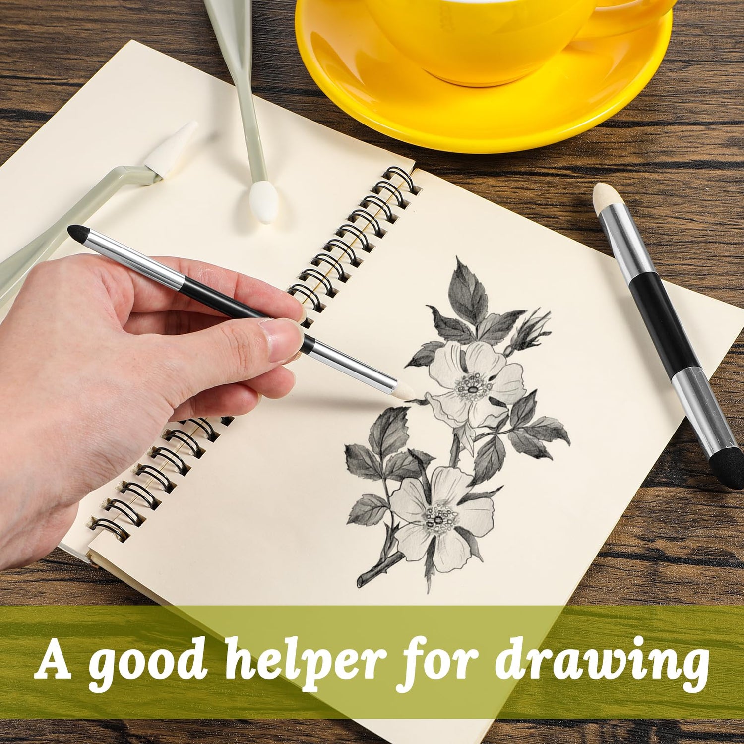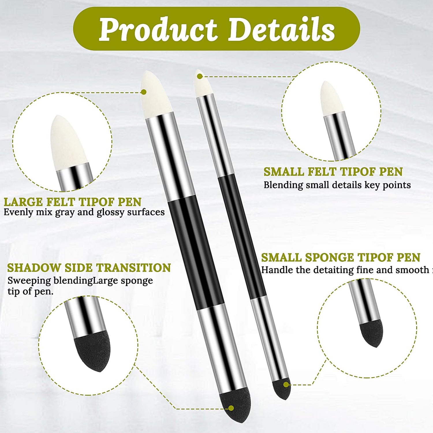 - Dual-end Design: The practical dual-end design of the friction sponge brush includes a larger-sized black sponge tip, which is softer and ideal for shading and initial blending, and a smaller-sized black sponge tip, which is perfect for handling local details. The white tip is made of wool, which is harder and is great for handling finer details. The larger white tip is suitable for blending midtones into shadows or blending brighter areas, while the smaller white tip is perfect for details.
