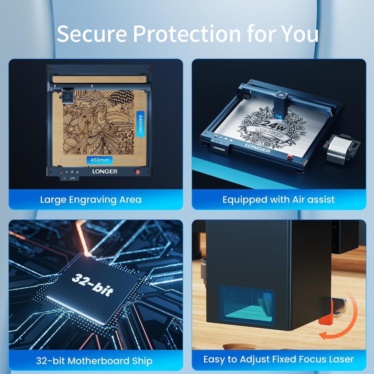 - 【Larger Engraving Area】The Longer Laser B1 has a working area of 17.72 x 17.32 inches, which is 23.75% larger compared to other home engraving machines with same output power available on the market. This laser engraving and cutting machine offers a larger size than traditional models, allowing you to fulfill a wider range of engraving and cutting needs. Has better performance in both small businesses and household use.