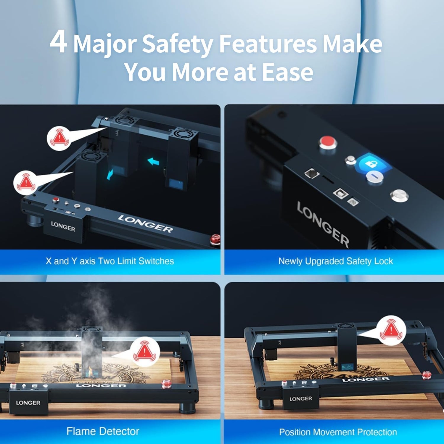 - Eight Safety Protection】Safety Lock: Restrict children from using the engraver; Laser Module Panoramic Filter Glass: Block blue light and filter 97% UV to protect eyes; Position Movement Protection: Stop the machine if it moves or tilts during operation; Flame Detector: Prevent wood burning for worry-free engraving; 2-Way Limit Switch: Alarm-triggered auto zero for laser head protection; Emergency Stop Button: Stop the machine for safety in accidents; Offline Protection; Thermal Protection.