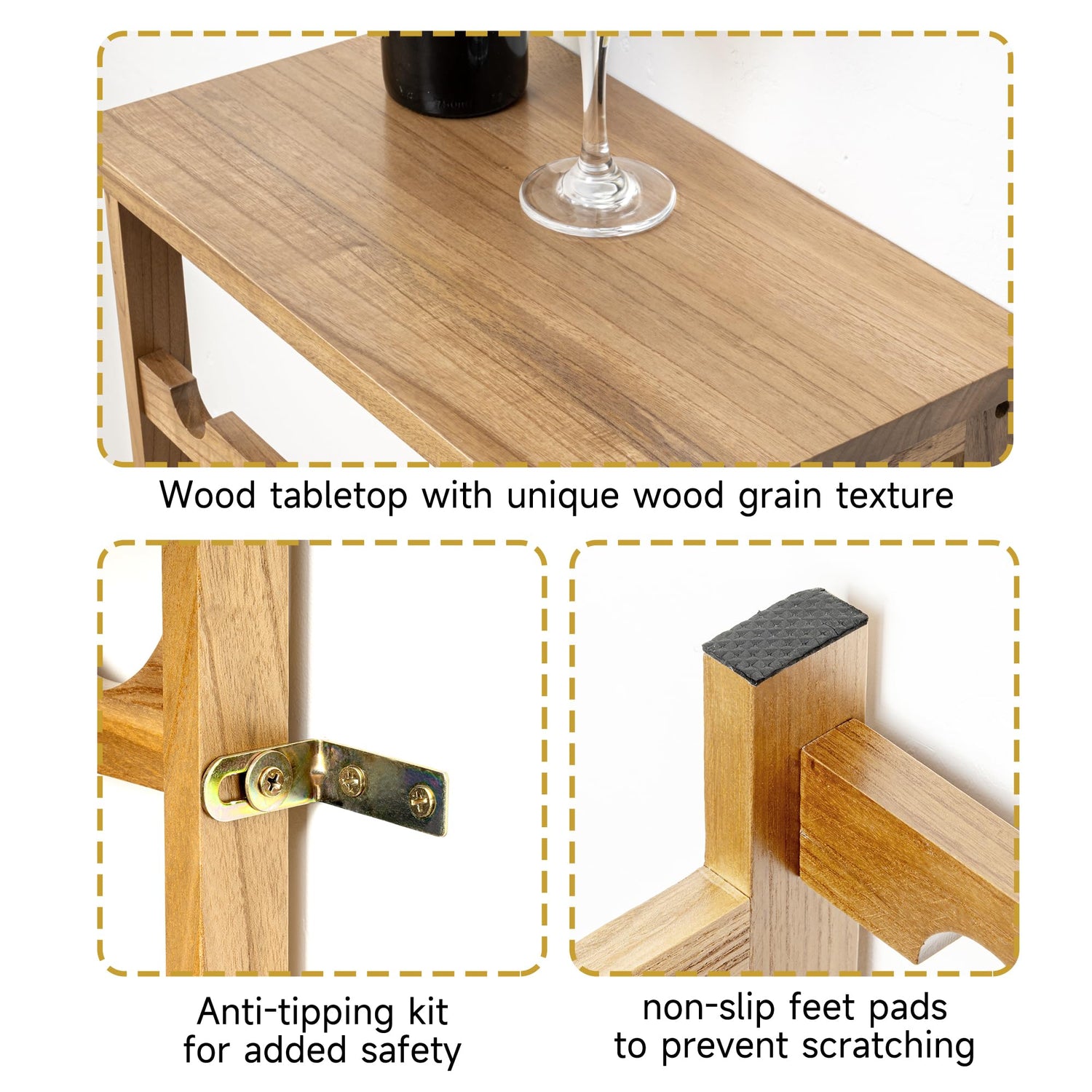 - 100% Natural Solid Wood - Made of 100% natural solid wood, this freestanding wine rack with tabletop is durable and stable. This wine bottle rack has a smooth appearance, simple, beautiful and organic. Each board has unique wood grain and beautiful wood knots, the glamorous wood texture provides a classic touch to your decor. The solid wood construction is made to last