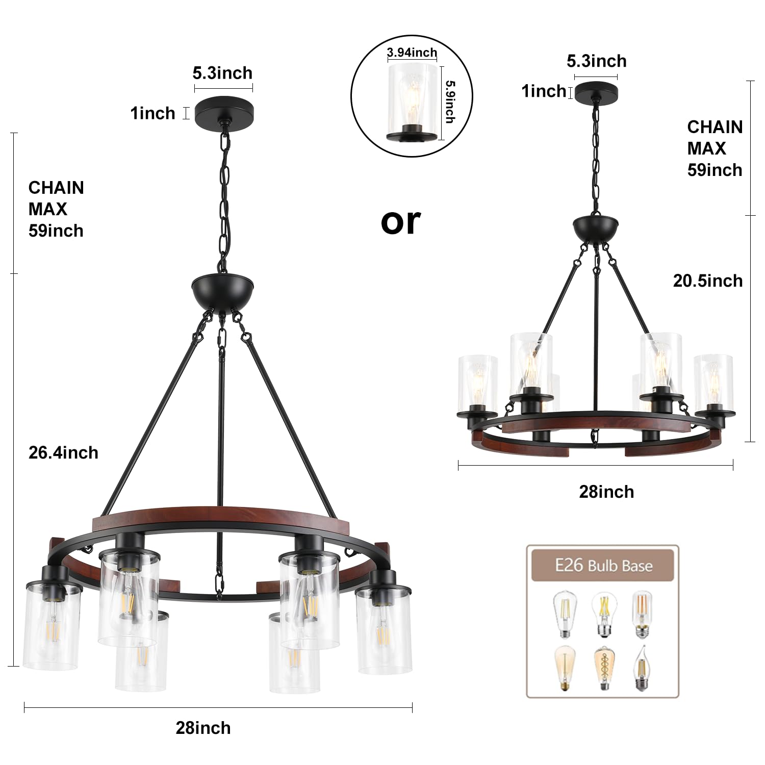 - 【Bulb Type】This farmhouse chandeliers for dining room works well with any E26 medium base bulb. Compatible with max 60W or lower LED, CFL, halogen, Edison or incandescent bulbs. Our black dining room chandeliers is fully dimmable when using dimmable bulbs and dimmer switch.(Not Included).