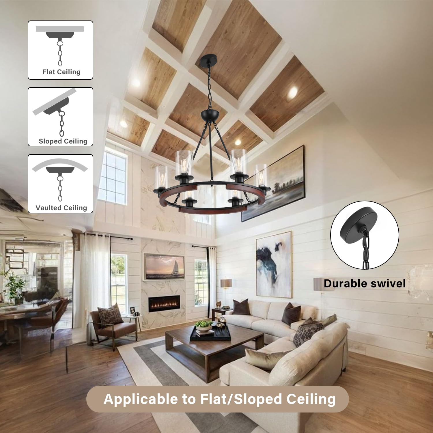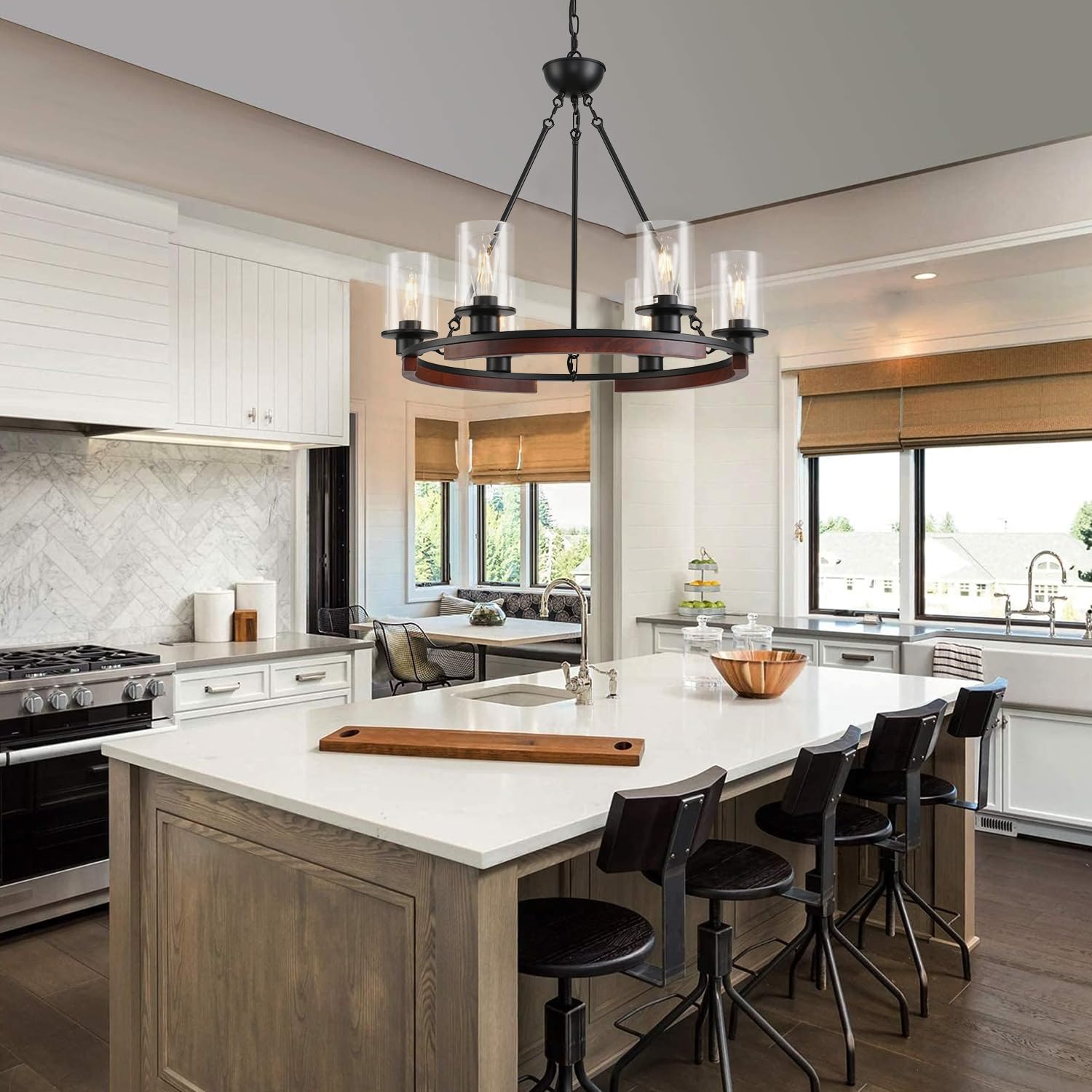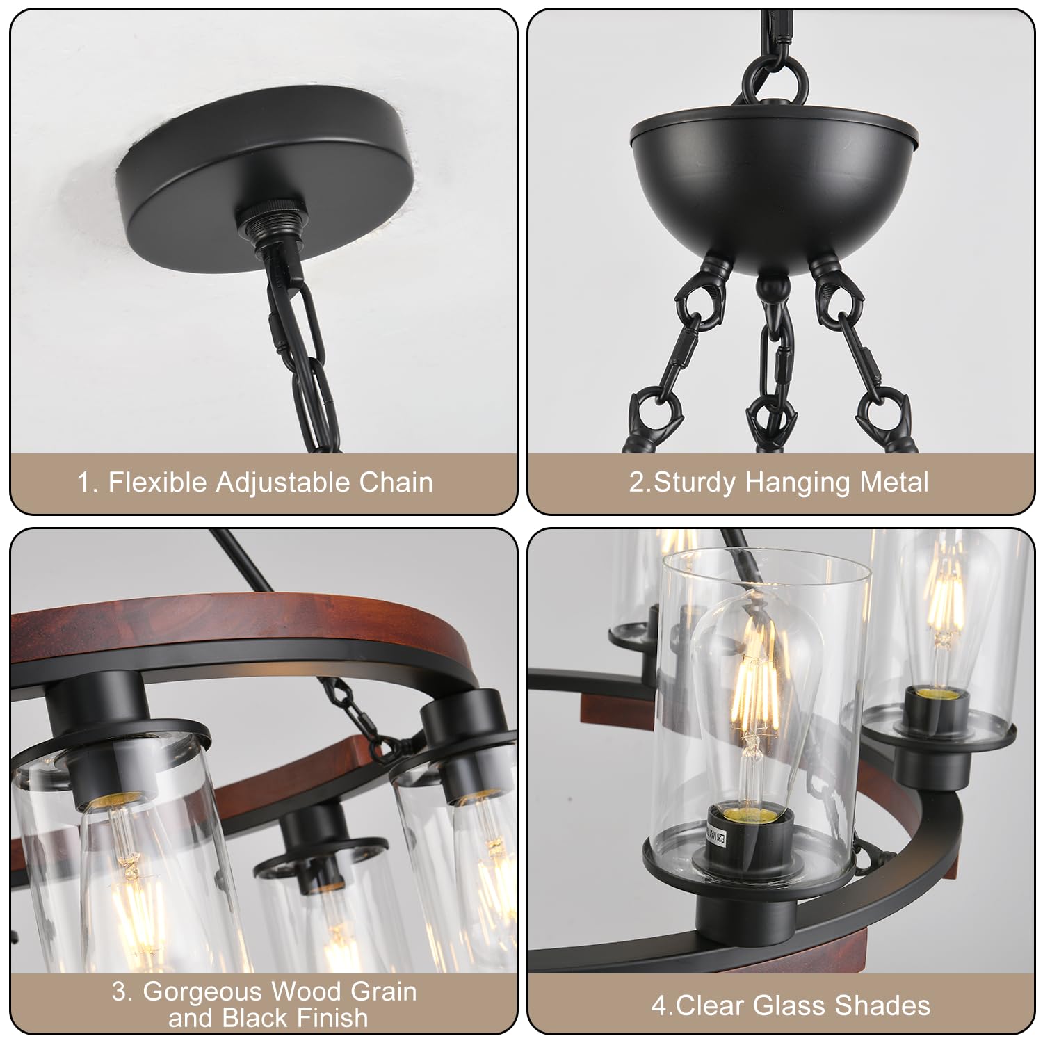 - 【Farmhouse Style】 This wagon wheeled chandelier consists of a black metal frame, wood and clear glass shade, reflecting a very unique modern farmhouse style. Adopts 6 clear glass shade, creates a great mix of rustic farmhouse and contemporary industrial style, adds a vibrant ambience to your home.The circle body portion of the chandelier can be installed facing up or down to meet your custom needs.