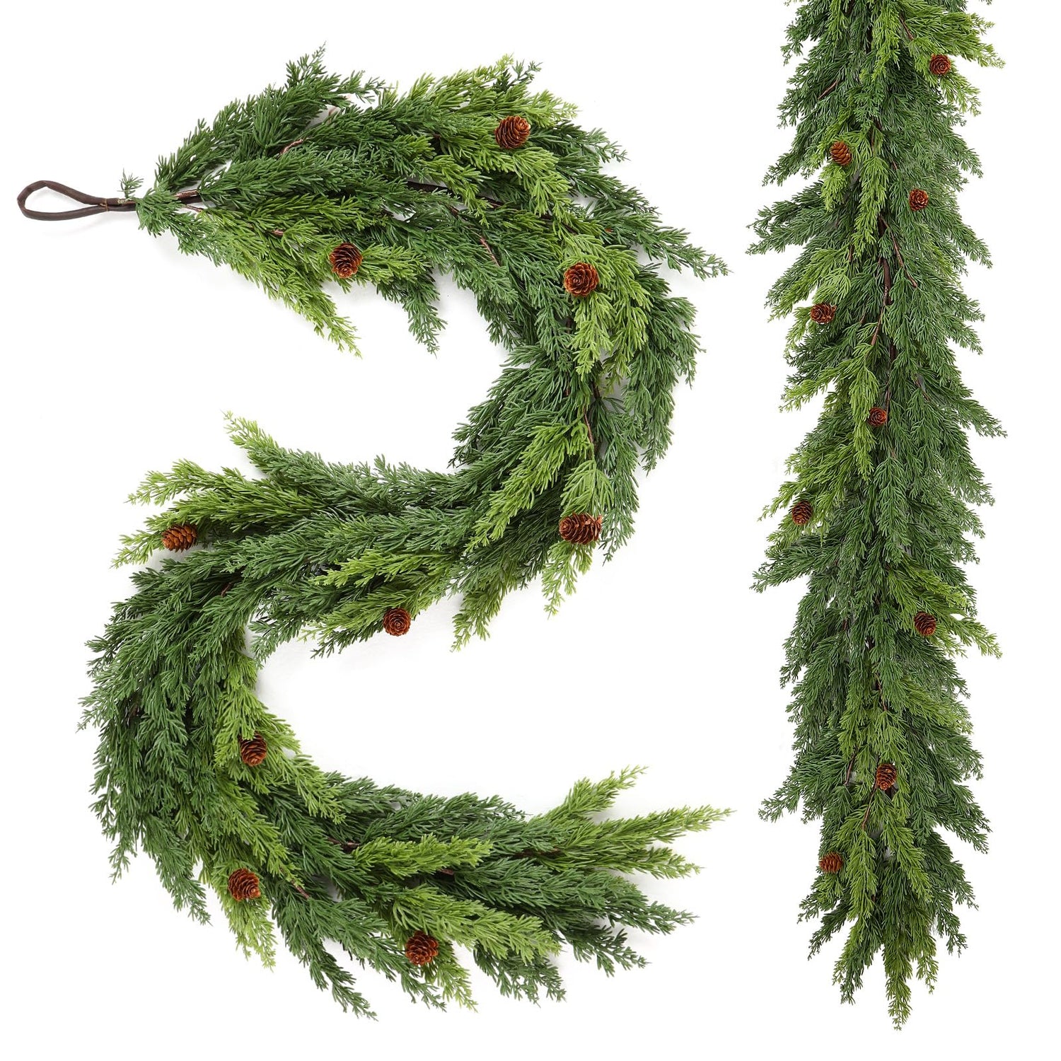2PCS Christmas Garland, Cedar Garland -Realistic Greenery Cypress Pine Garland with Pinecone for Mantle Table Railing Fireplace Indoor & Outdoor Christmas Decoration