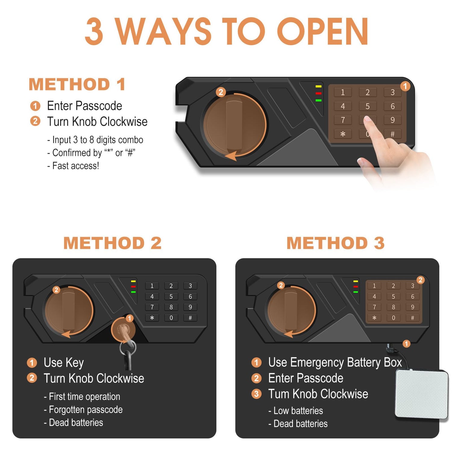 - 🔥🔥🔥【3 WAYS TO OPEN IT】: ①Personal code/master code+turning knob. ②Emergency keys+turning knob.The first time you get the safe, please use the key to open the door. ③External battery box+personal code/master code+turning knob. Attention: Don't keep the emergency keys in the safe. If you forget the password, you will not be able to open it.