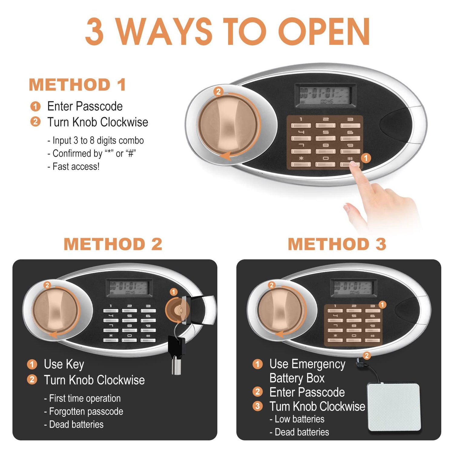 - 🔥🔥🔥【3 WAYS TO OPEN IT】①Personal code/master code+turning knob. ②Emergency keys+turning knob.The first time you get the safe, please use the key to open the door. ③External battery box+personal code/master code+turning knob. Attention: Don't keep the emergency keys in the safe. If you forget the password, you will not be able to open it