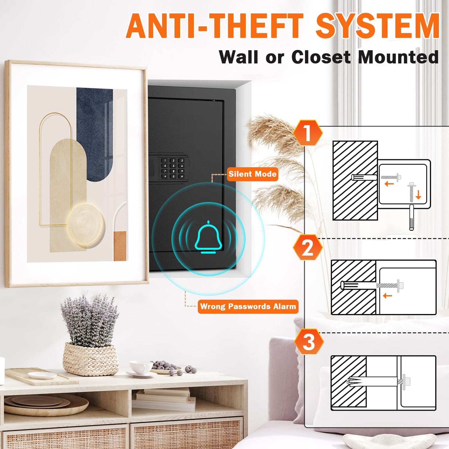 - INSTALL TO THE WALL/CLOSET/FLOOR: The compact dimensions of the safe make it easy to fit into any desired location within your home. Whether you choose to place it in a closet, under a desk, or securely mount it to a wall or floor, the safe seamlessly integrates into your living space without drawing unnecessary attention