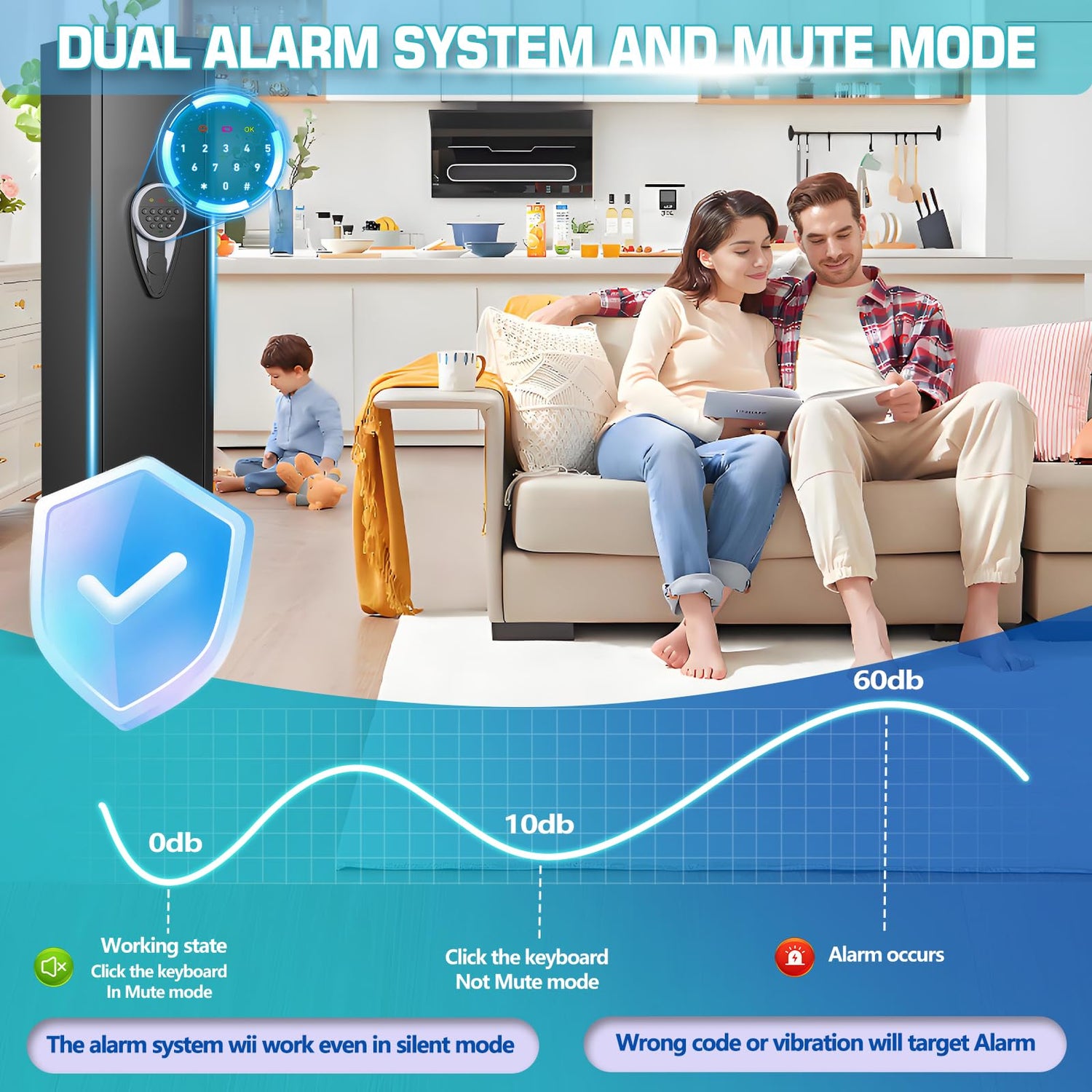 - [DUAL ALARM SYSTEM & MUTE MODE] The gun safe will activate the alarm system if an incorrect combination is entered 3 times in a row and will also trigger a vibration alarm if the gun cabinet is subjected to violent shaking. The alarm will be canceled after entering the correct combination. If you don't want the gun safe to make noise, you can turn on the mute function. (Note: Wrong code in mute mode will also trigger the alarm system)