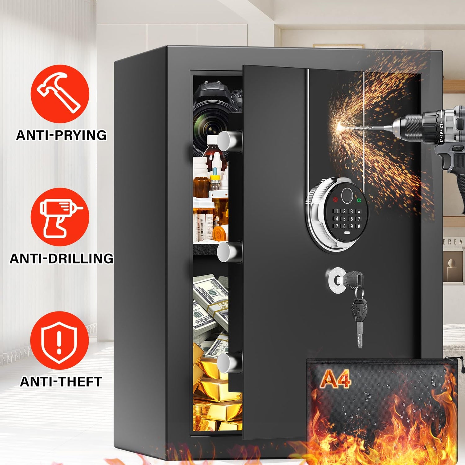 - 【LARGE DOCUMENT SAFE & FIREPROOF WATERPROOF BAG】The interior of the safe (13.5"W * 12D" * 19.3"H) is spacious, more than sufficient for guns, money, jewelry, documents and has a shelf to split the safe in half or remove for full use of larger items. The security safe comes with a extra fireproof waterproof bag which can withstand water splash and high temperatures, ensuring the safety of sensitive paperwork, family photos, birth certificates, and other valuables in case of a fire or flood.