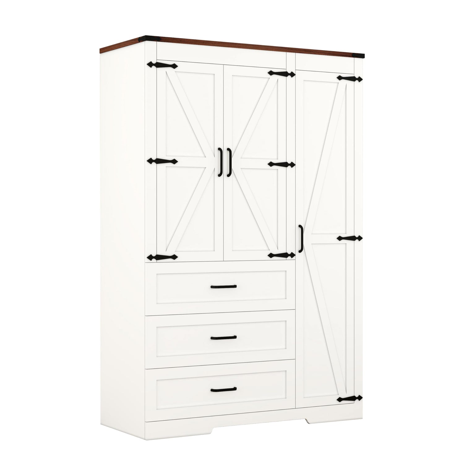 3 Door Armoire Wardrobe Closet Cabinet with 3 Drawers and Drawers, Farmhouse Bedroom Armoire with Hanging Rod and Adjustable Shelves, Large Capacity Storage Wardrobe Armoire for Bedroom, White
