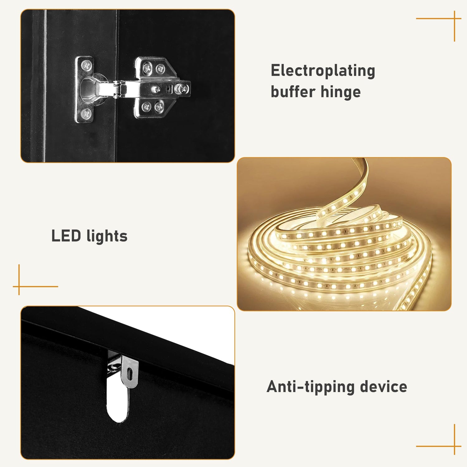 3 Doors Armoire Wardrobe Closet with Mirror, LED Armoire with Doors and Drawers, Wooden Wardrobe Storage Cabinet with Hanging Rod, Adjustable Shelves, Black