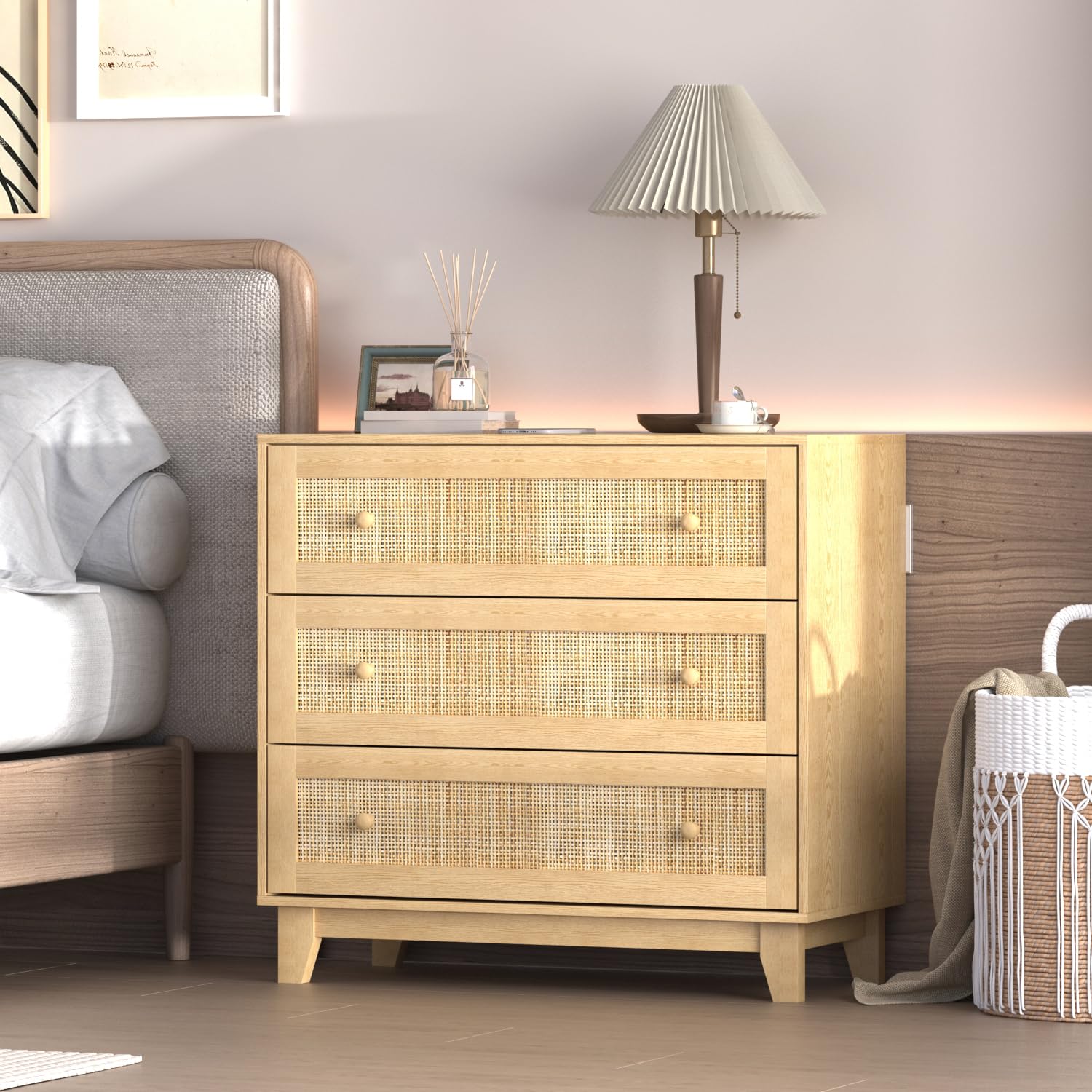 3 Drawer Rattan Dresser for Bedroom, Modern Natural Wooden Dresser, Beside Table for Closet, Boho Nightstand Chests of Drawers for Bedroom, Living Room, Entryway, Hallway