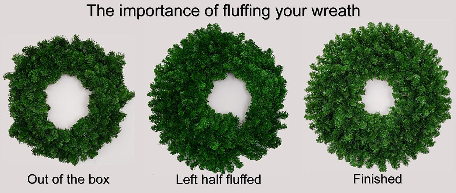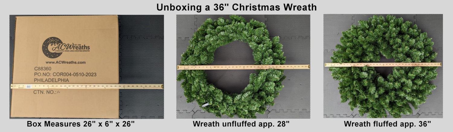 - THE 36" WREATH WILL SHIP IN A 26" X 6" X 26" BOX. The branches will need to be extended and the wreath opened up or "fluffed" to look like the image.