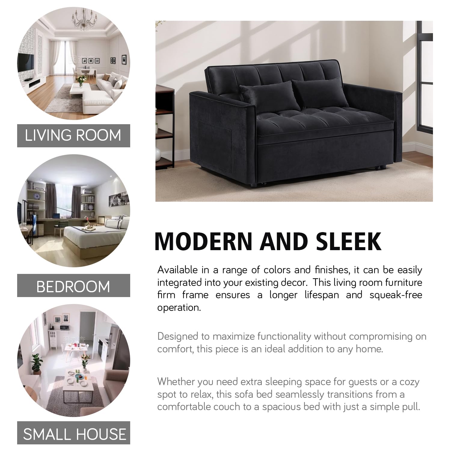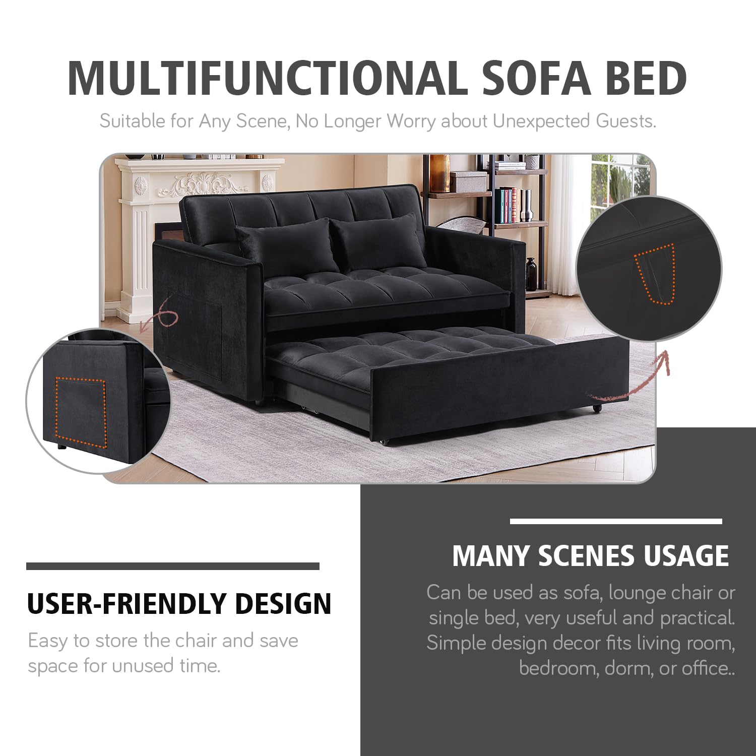 3 In 1 Velvet Convertible Sofa Bed, Pull Out Couch Bed with Reclining Backrest And 2 Pillows, 54" Full Size Loveseat Sleeper Sofa Futon Couch Bed, Couches For Small Spaces, Living Room (Black)