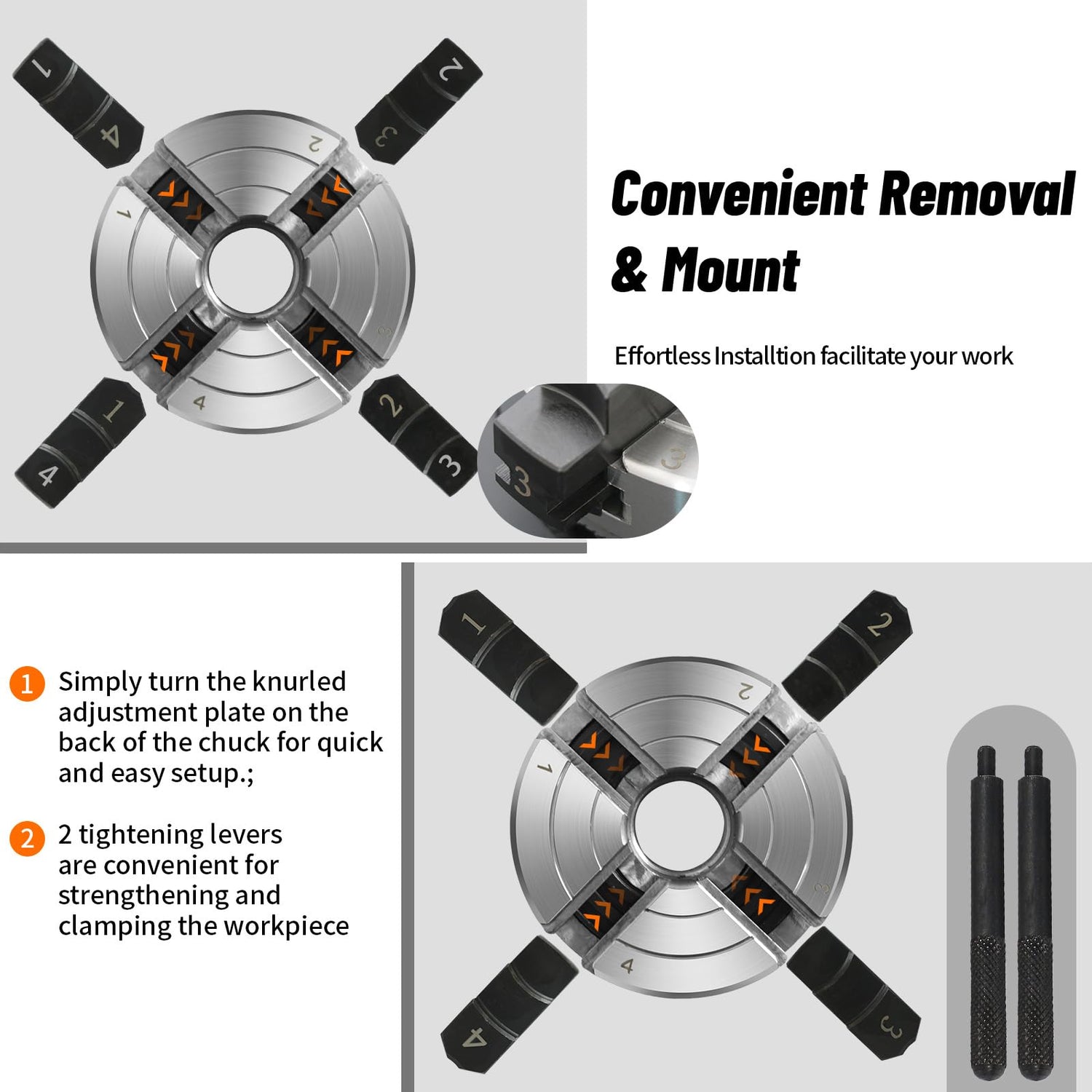 - Simple & Easy Operation: The self-centering 4-Jaw chuck doesn't require repeated calibration during installation. All you need to do is install it in the right order and use it with peace of mind.
