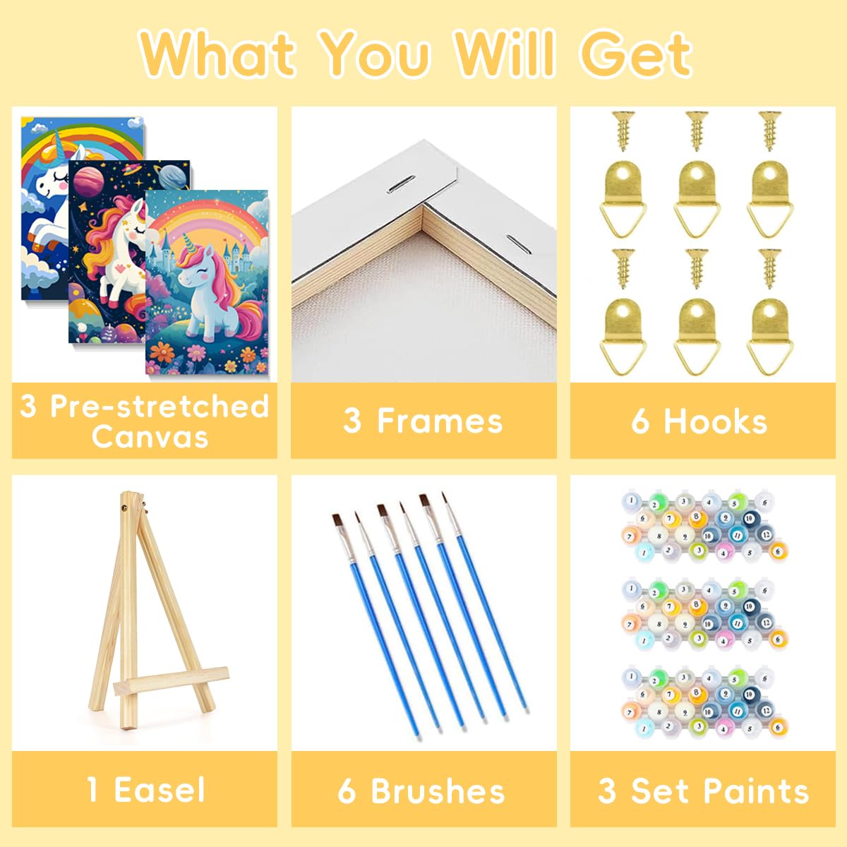 - Kids Paint by Number Kits: Each kits come with 3 pcs pre-printed textured canvas with wooden frame(8x12 inch), 3 set acrylic paints, 6 set brushes, 6 hooks, 6 screws, 1 easel