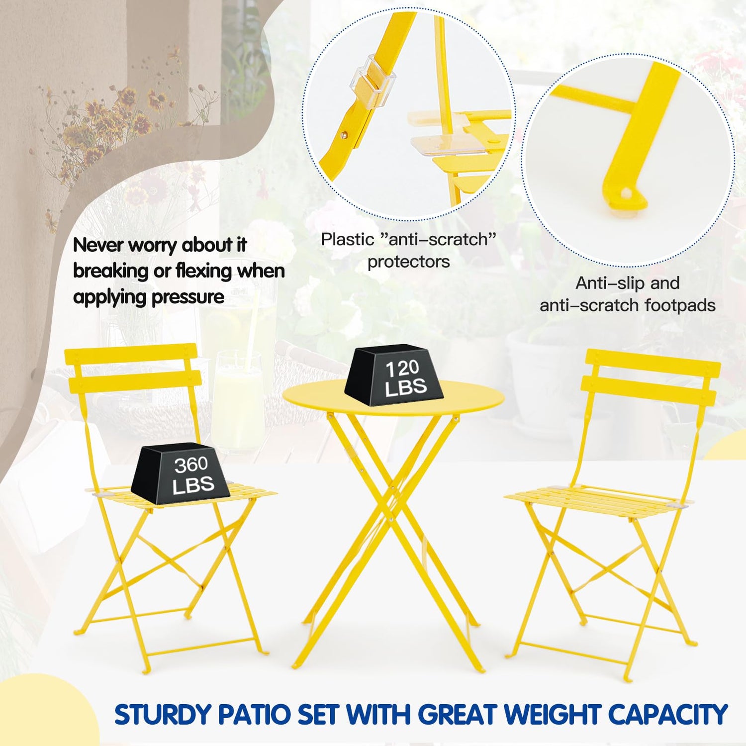 - 🍊STURDY&NO ASSEMBLY: This small yellow bistro set came pre-assembled, Just take it out of the box and unfold them and you're done! The materials manufactured in this bistro table and chairs set are wrought iron, sturdy enough for persons under 360 pounds