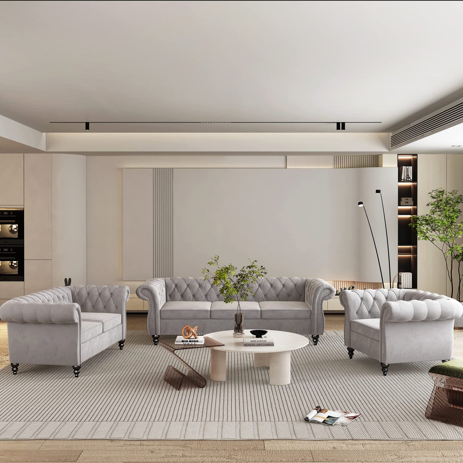 3 Piece Living Room Set, Velvet Chesterfield Sofa Loveseat Couch Chair with Scroll Arms and Nailhead for Living Room, Office (Grey)