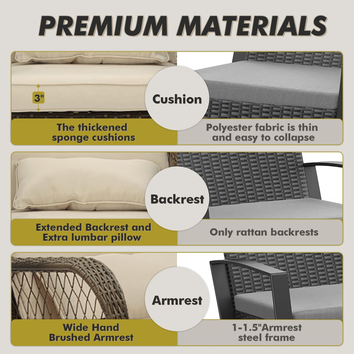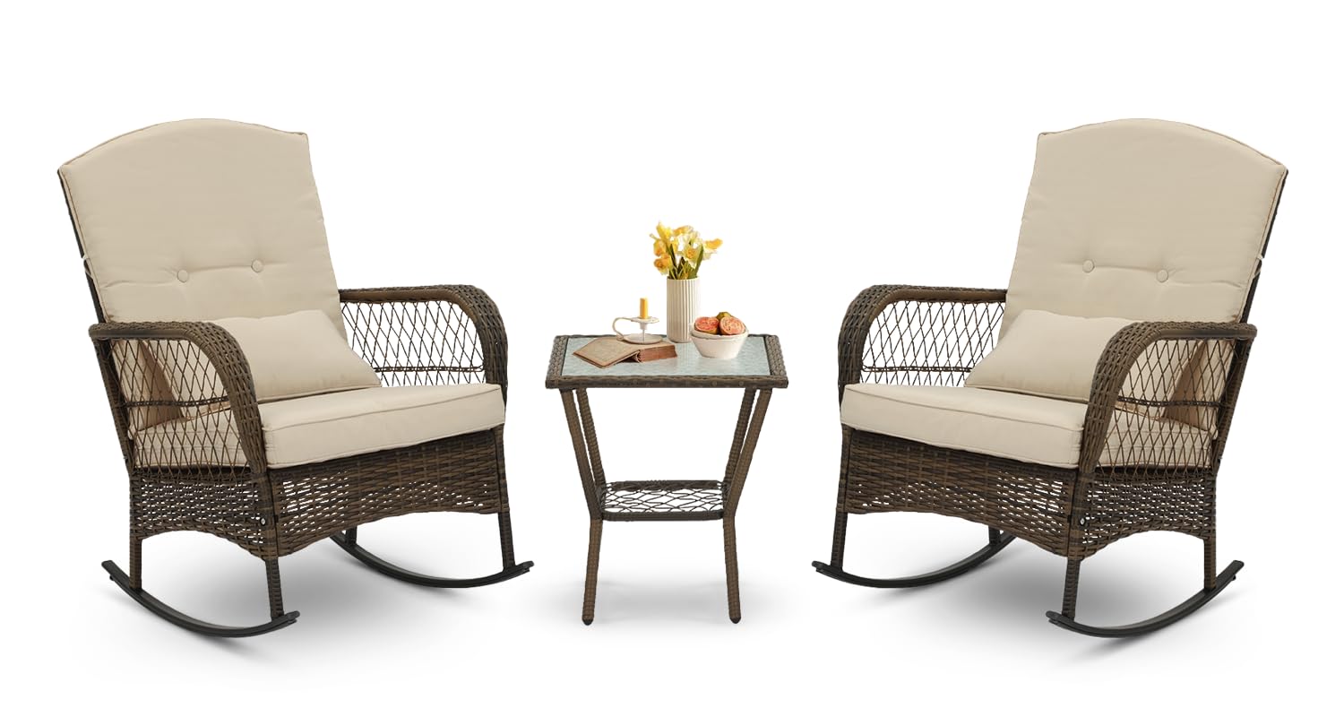 - Durable and Safe Design: Crafted from robust, weather-resistant materials, this wicker patio furniture set is built to withstand the elements. The rocking chair outdoor design offers a gentle rocking motion, while the sturdy powder-coated steel frame and anti-slip base ensure stability and safety for all your outdoor activities.