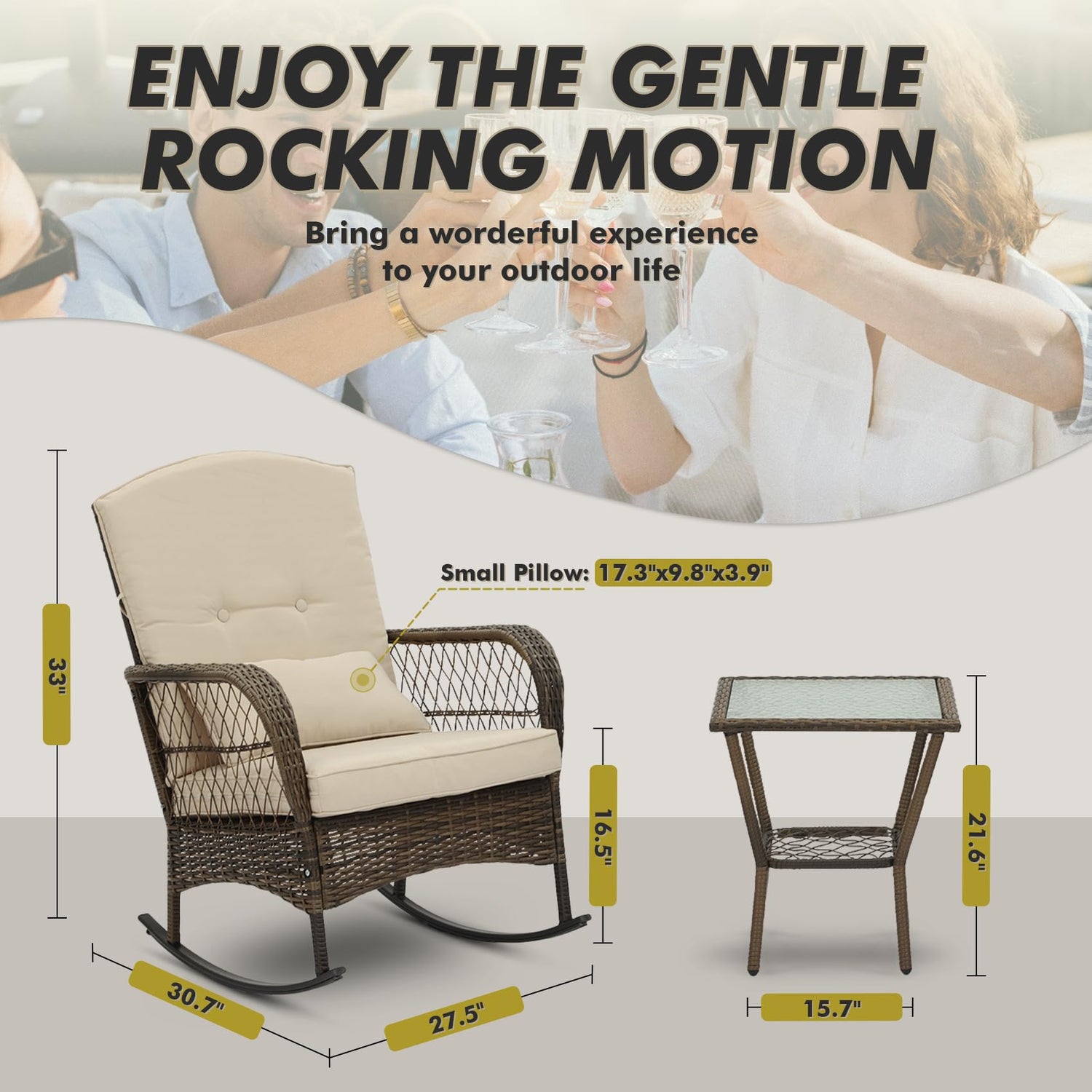 - Easy Maintenance: Featuring removable zippers on the cushion covers, this outdoor rocking chair set is designed for hassle-free cleaning. The durable materials resist stains and fading, ensuring that your outdoor bistro set look great season after season.
