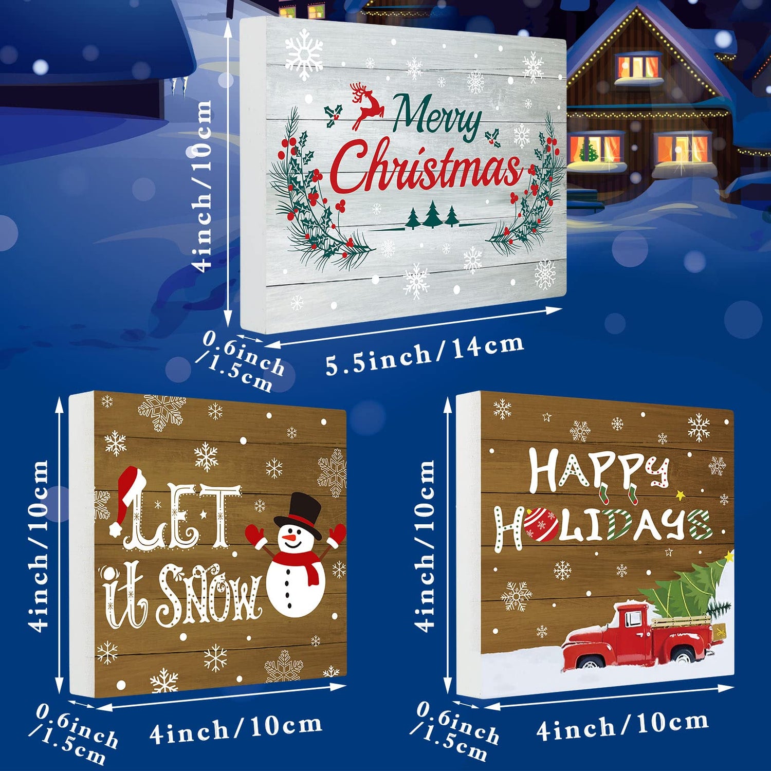 - What you will receive: 1 piece wood sign that says [let it snow], 1 piece wood sign that says [happy holidays], 1 piece wood sign that says [Merry Christmas]; Tiered tray and other decor/accessories not included and are only for a display effect