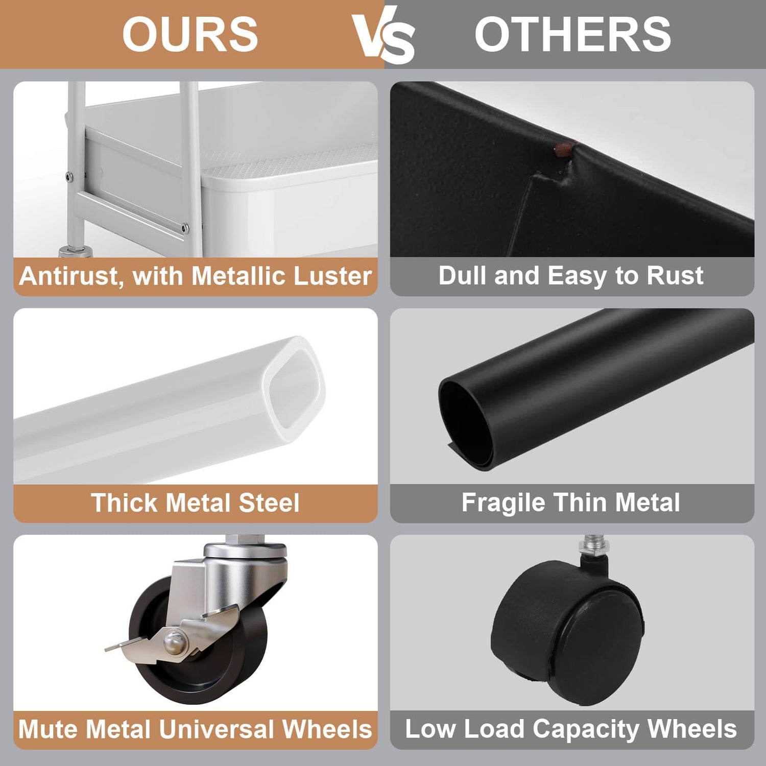 - 【Sturdy and Durable】The metal rolling cart boasts a sturdy and durable powder-coated steel frame and shelves that are strong, resilient, and built to last.