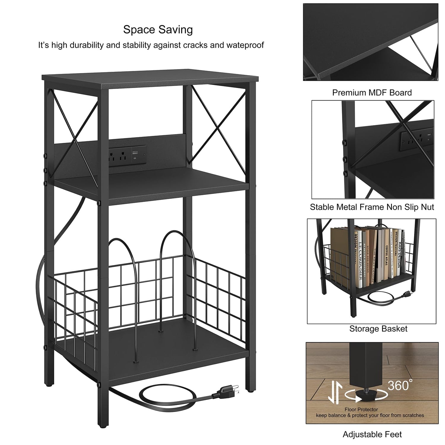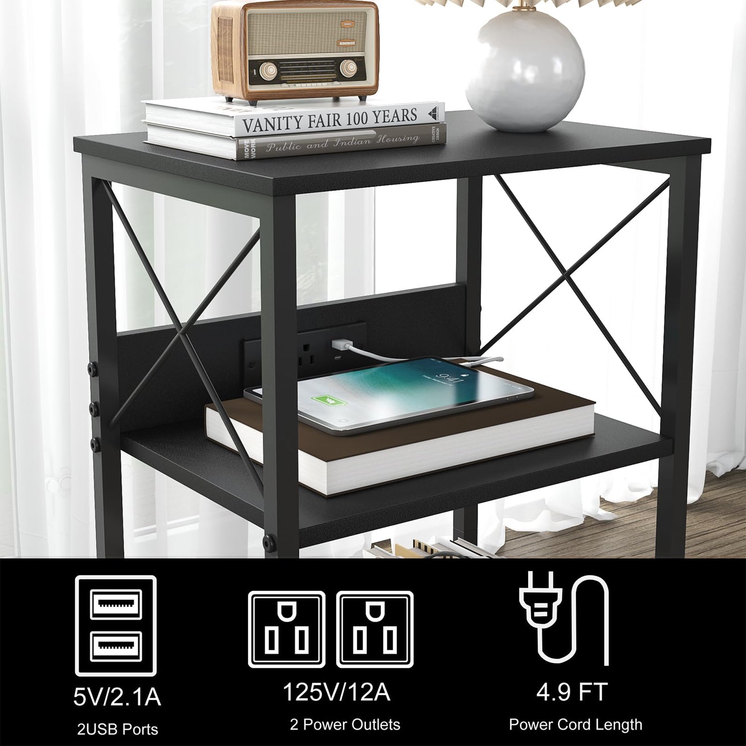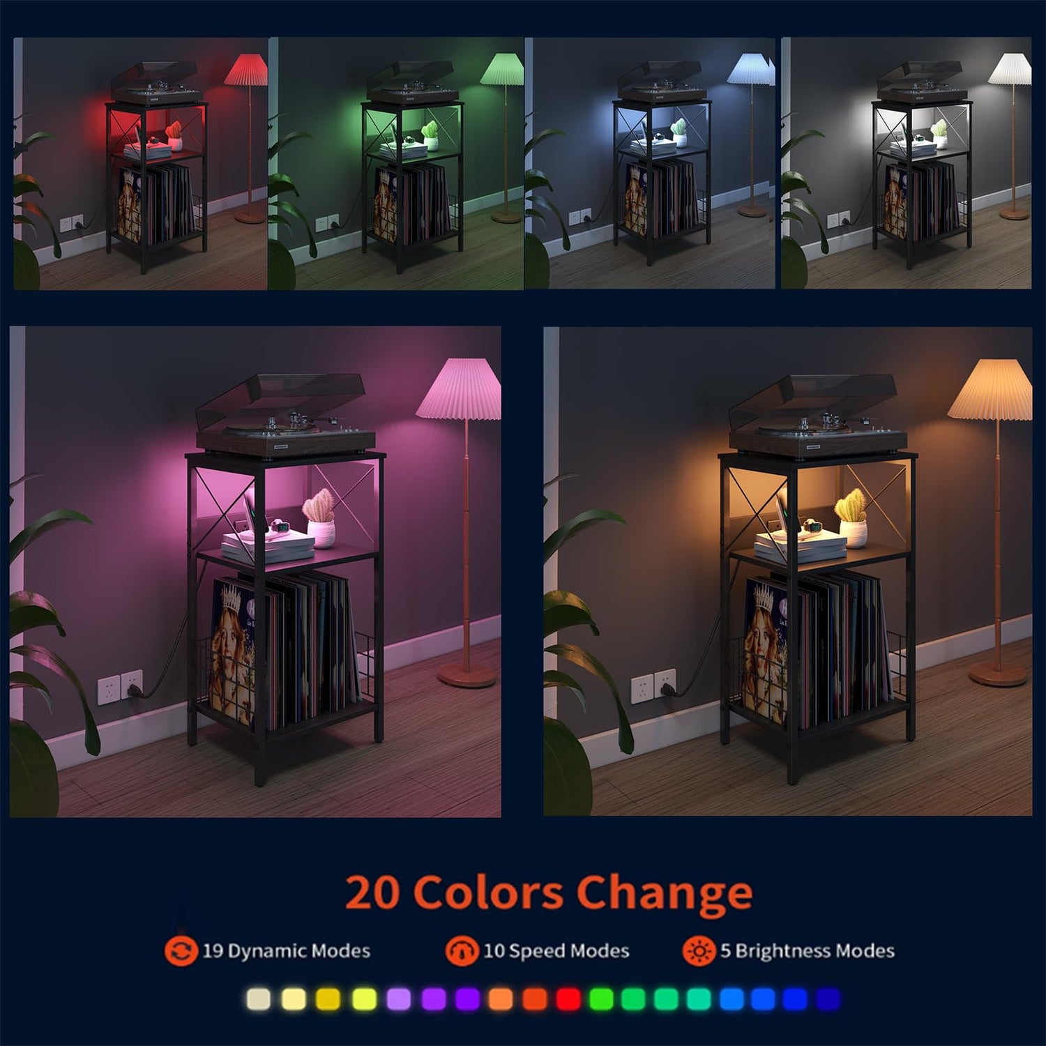 3 Tiers End Table with Charging Station,LED Side Table Turntable Stand for Vinyl Storage, Records Shelf for Albums, Vinyl Holder Shelf Records Player Stand for Living Room, Bedroom Black