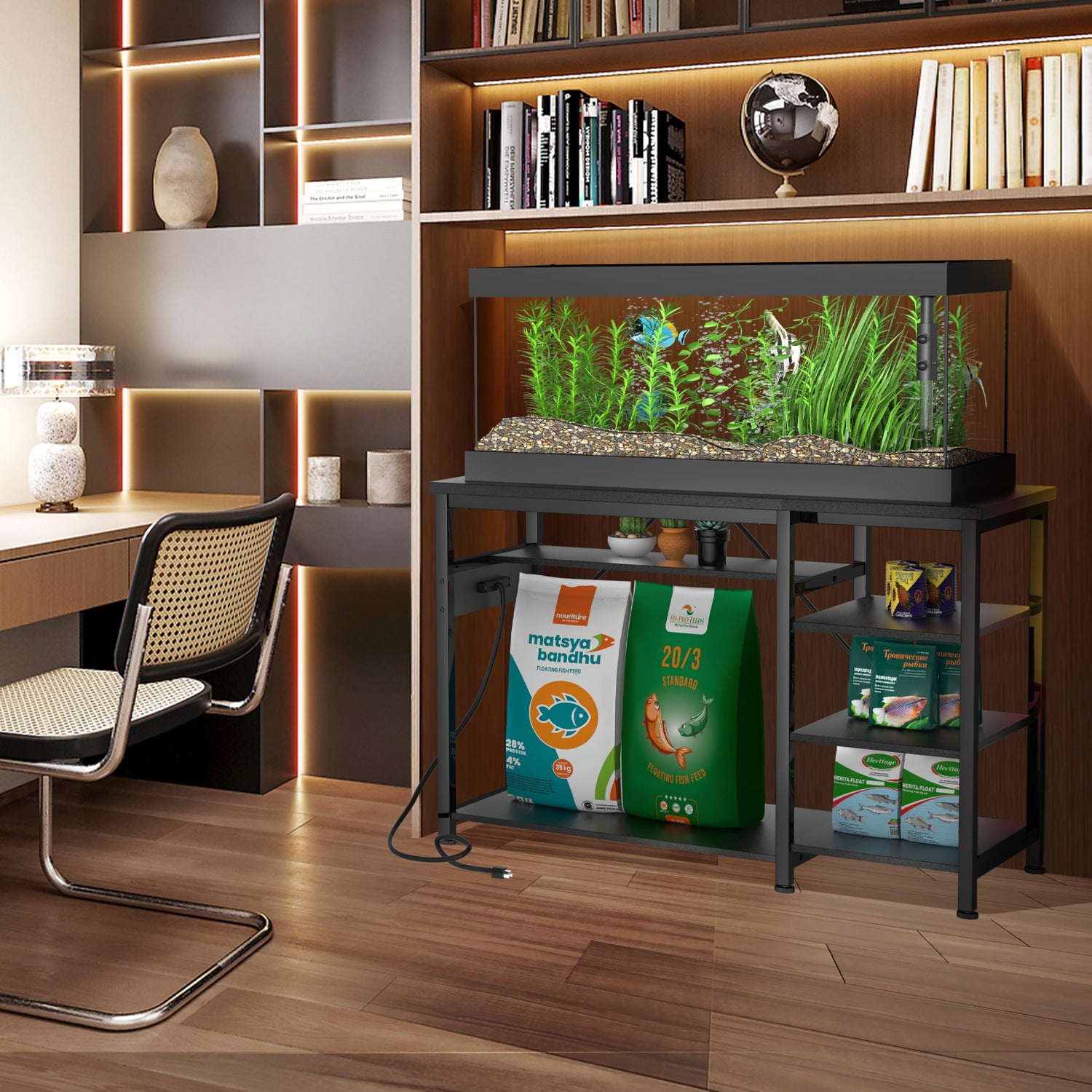 - Convenient Storage Features: Equipped with a first-level compartment on the right side, our stand offers easy access to essentials like fish food, nets, and water conditioners. The thoughtful design includes specific spaces for seamless organization, while the removable compartment allows for accommodating canister filters and CO2 hoses. Plus, the back opening ensures a tidy environment and effortless access to your supplies.