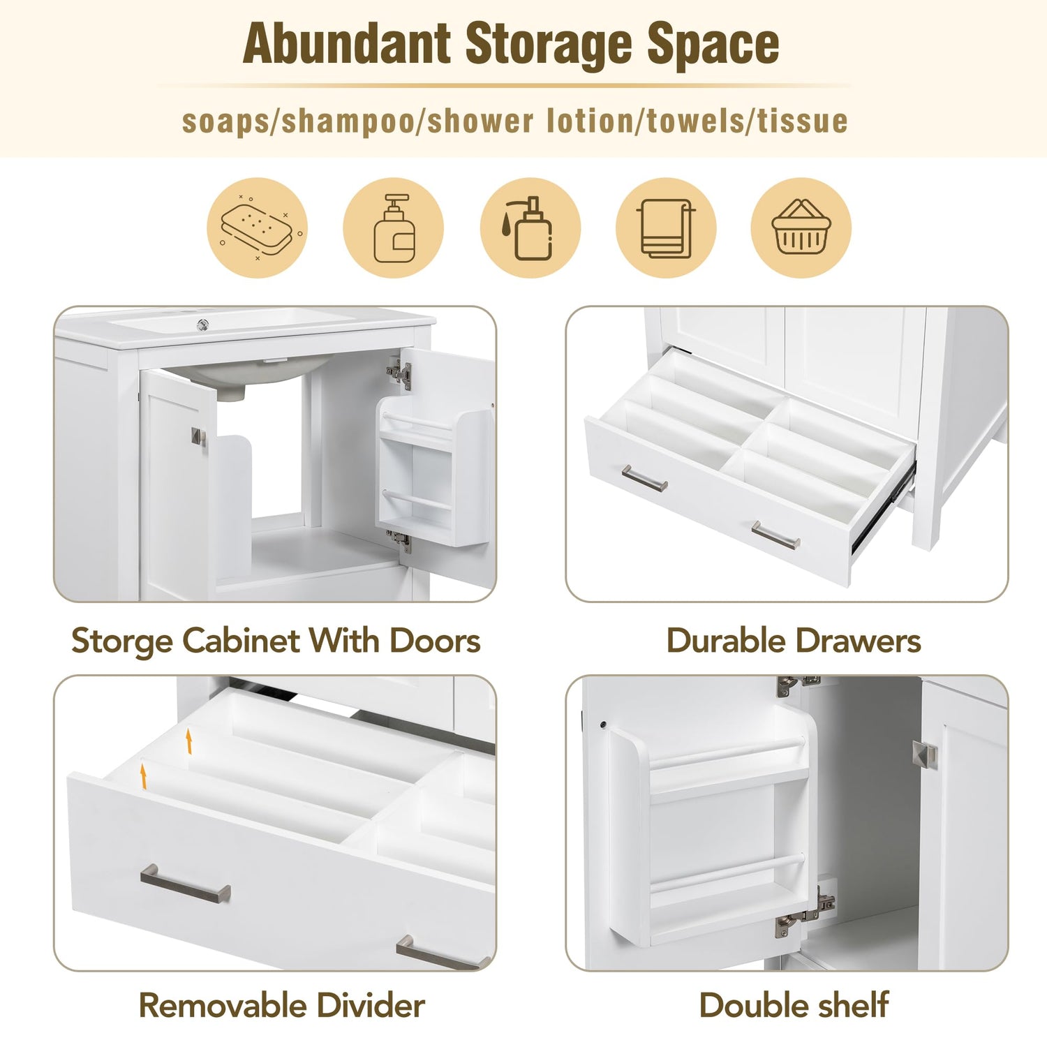 - [30 Inch Bathroom Vanity with Ample Storage Space]: Our 30 inch bathroom vanity is designed with convenient storage in mind. The bathroom vanity cabinet door is equipped with built-in shelves, providing a safe space to store essential shower products such as shampoo and shower gel. The bathroom vanity drawers are carefully designed with partitioned compartments to neatly store bathroom essentials and keep the bathroom clean and orderly.