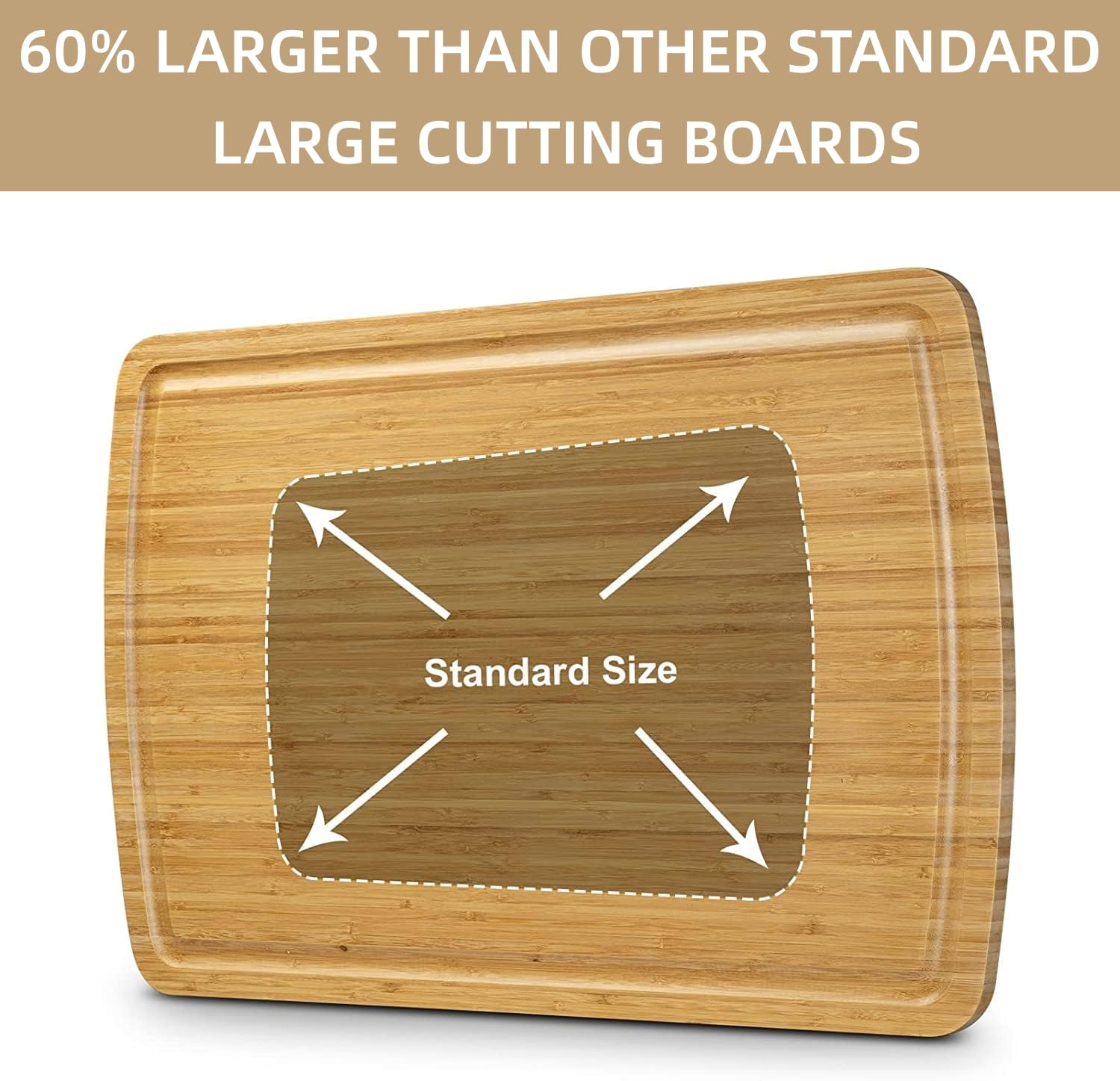 - Versatile Kitchen Essential: This bamboo cutting board is double-sided to handle raw and cooked ingredients separately. It can be used not only as a cutting board but also as a charcuterie board, noodle board, stove cover board, over sink cutting board, and over the counter cutting board. This cutting board makes a great gift for occasions such as Father's Day, Mother's Day, anniversaries, Christmas, housewarming parties, and more.