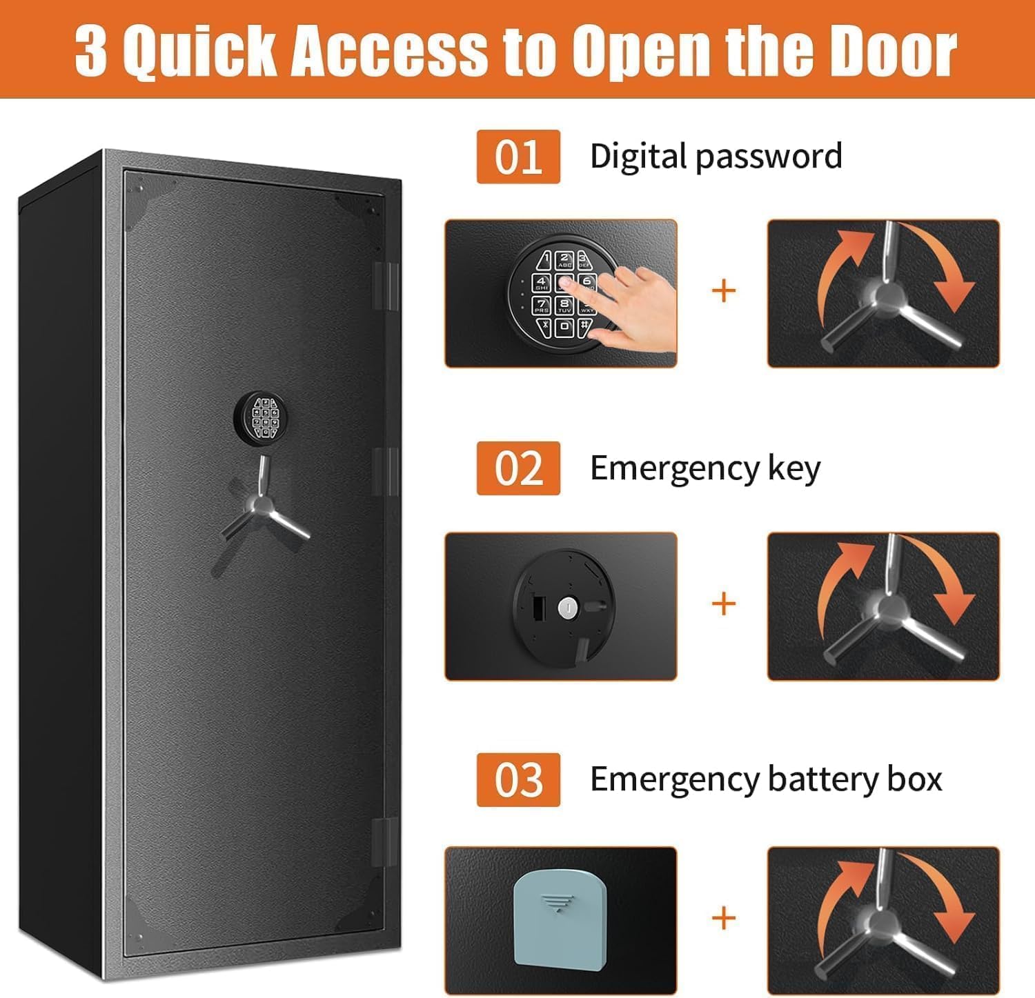 - 【3 Quick Access& External Battery &180-Degree Full Access Door】: 3 ways to quickly enter the gun safe for rifles and pistols: Digital password to enter; If the battery voltage is insufficient, the emergency key or external battery box can be used to operate. The keyhole and external battery port is behinds the key panel. The safe features a 180-degree full access door, which provides a wide and unobstructed opening for easy retrieval of your firearms and enhances accessibility and convenience.