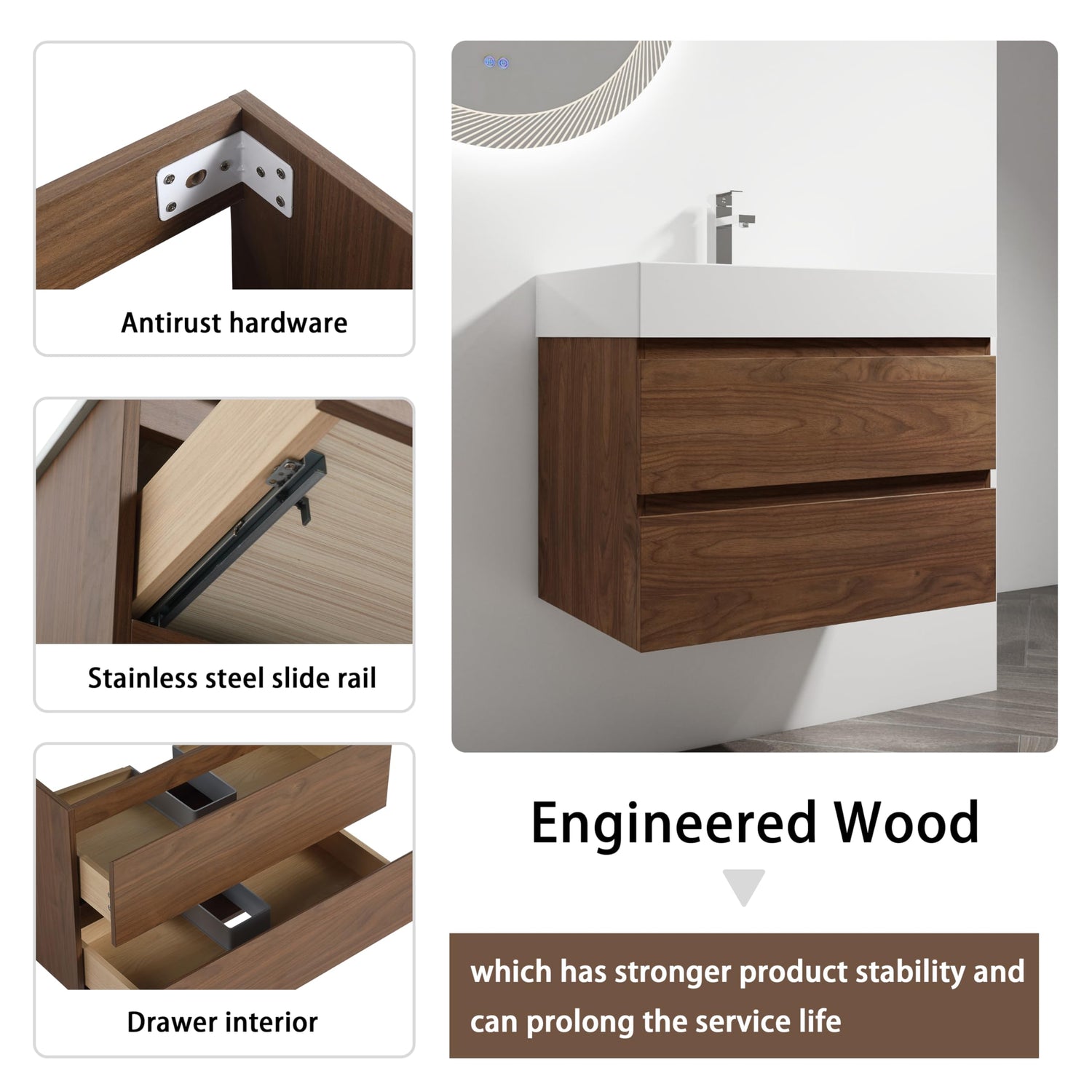 Product Features Wood Grain Design Vanity: The simple log line cutting design brings you the feeling of being close to nature while enjoying the modern style. 24", 30" and 36" can be chosen at will to meet various size decoration of your bathrooms, bedrooms, guest room. Smooth 2/3 Extension Drawer Slides: In order to better conform to North American living habits and optimize storage space, two drawers with soft close 2/3 retractable drawer slides have been added to the product design. Thick Edge Resin Sink: The diversified resin basin design allows us to escape from the traditional countertop. The lines and shapes of the products bring us enjoyment that can not be provided by ceramic countertop or stone countertop. Durable Matieral: This bathroom sink cabinet is crafted from premium plywood, which is designed to not only withstand threats of moisture and humidity but also easy to clean and maintain. Spacious Storage Space: The bathroom vanity cabinet with 2 sliding drawers offer sufficient storage to easily accommodate your essential bath items like toiletries, soaps, shampoos, shavers, mirrors in addition to your towels.