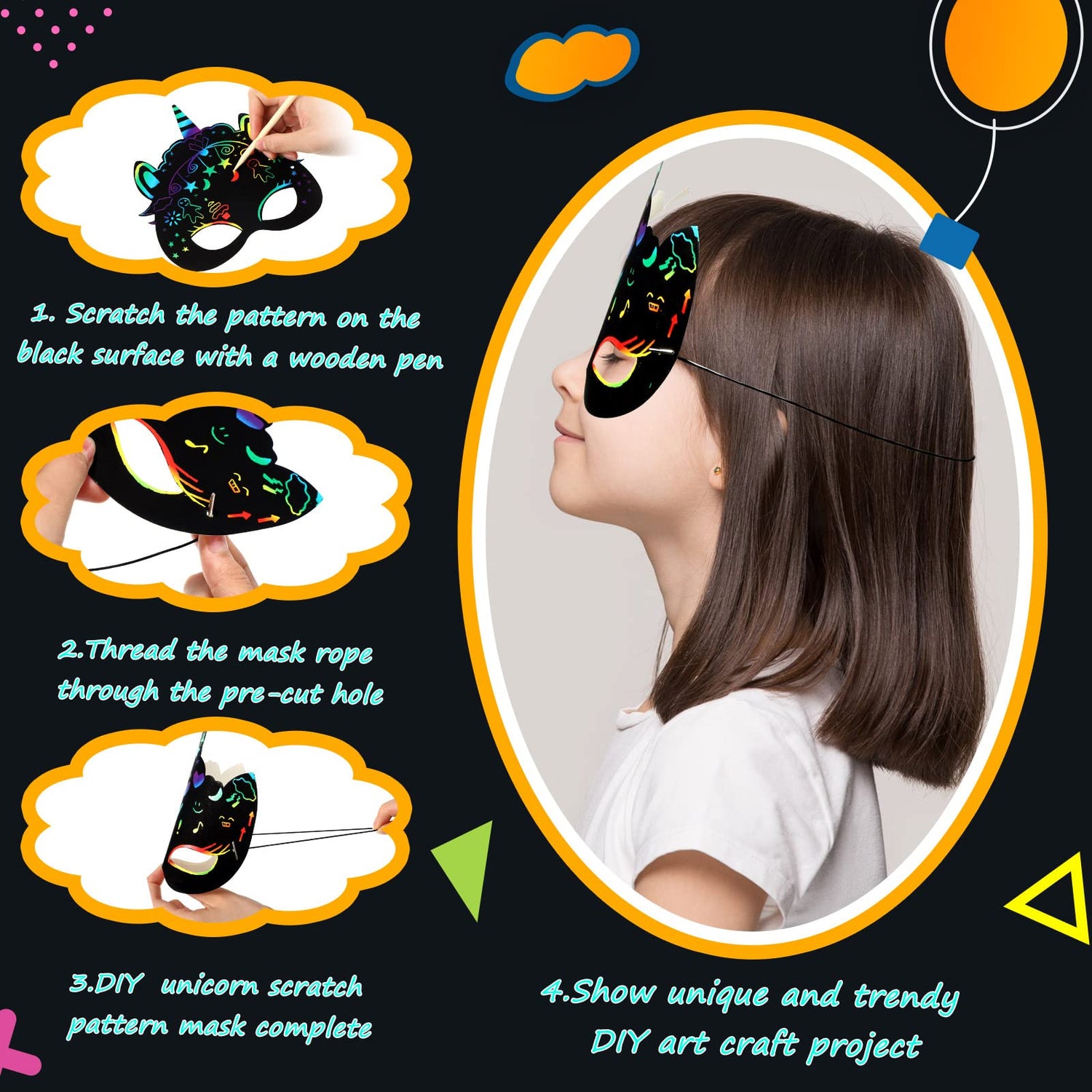 - Use Easily: first, you need to prepare unicorn art set accessories for unicorn mask DIY; Then, draw your own pattern by scratching on the party masks for women with a wooden stylus; Finally, when finished, you can install the elastic band on the mask