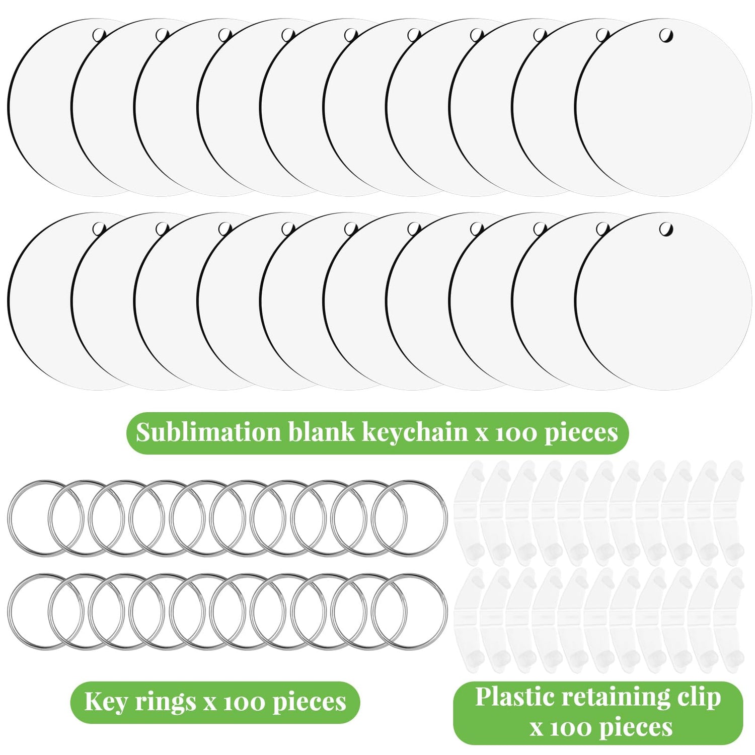 - Bulk sublimation keychain blanks: Includes 100 double sided mdf sublimation keychain blanks, along with 100 key rings and 100 plastic clips. with this large quantity available, you can create personalized keychains for yourself