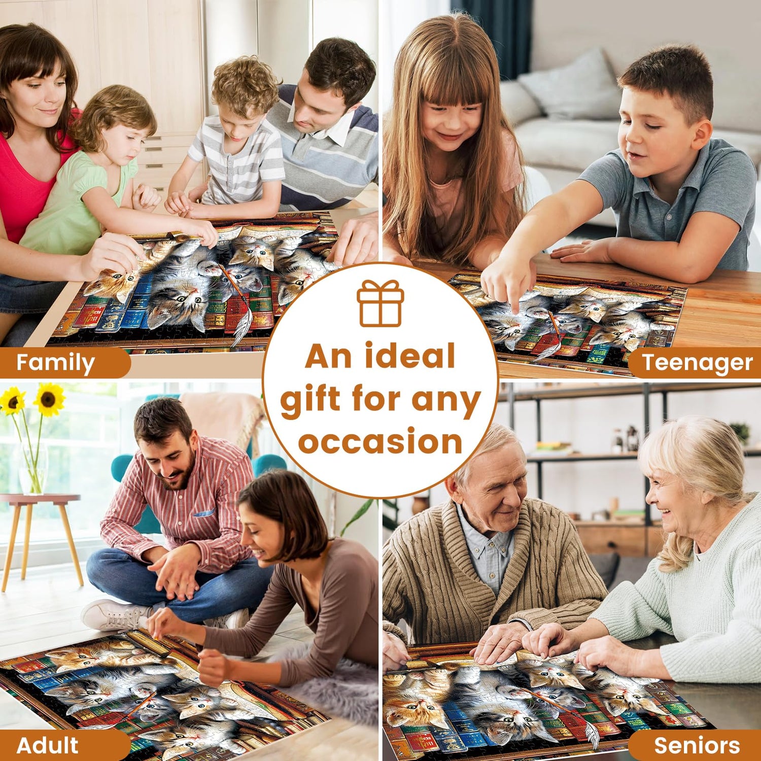 - [Cute Cat Jigsaw Puzzle]: This charming puzzle showcases five playful kittens on a desk, with a cozy bookcase in the background. Enjoy a relaxing time piecing it together, one piece at a time, to create a delightful and harmonious scene