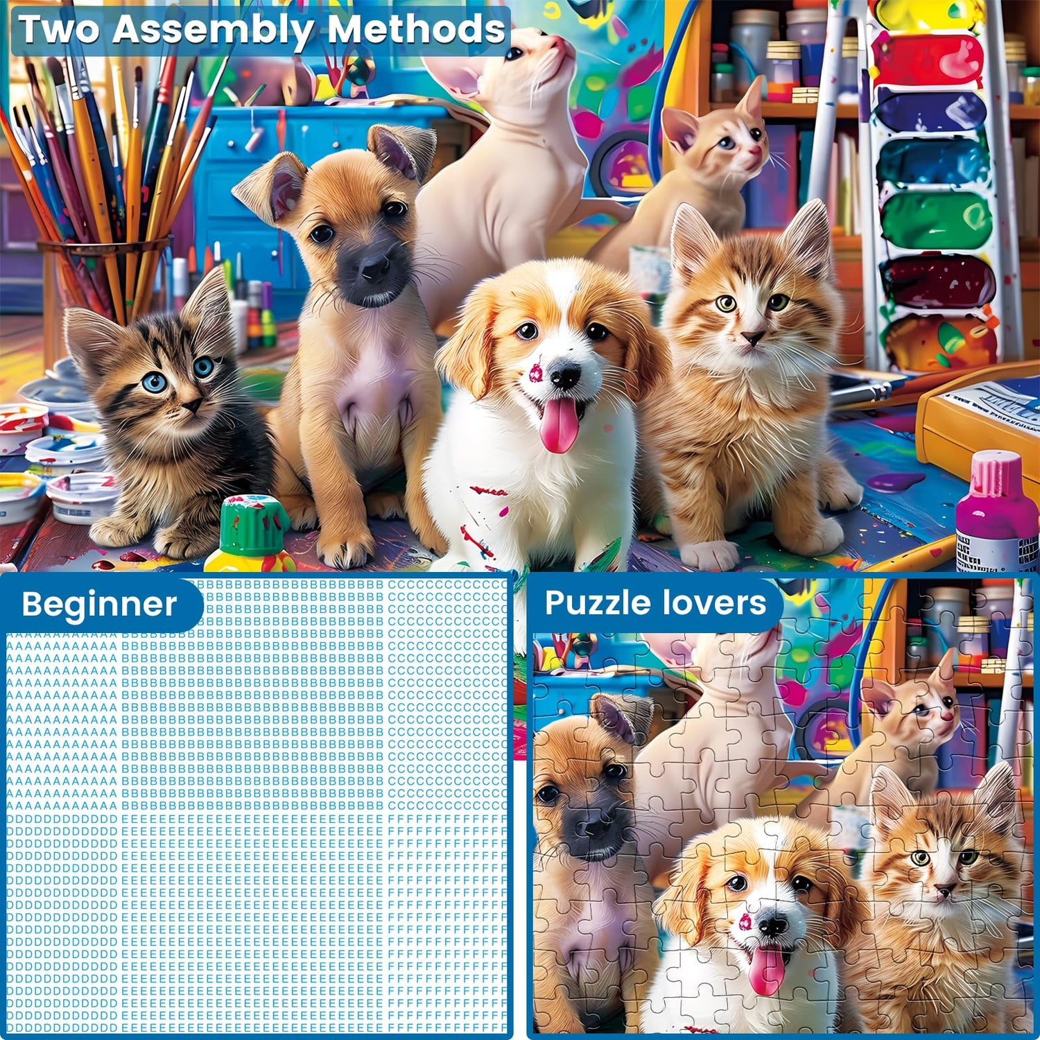 - Cute Dog and Cats Jigsaw Puzzles: This 300 piece puzzle features adorable puppies and cats. A group of puppies and kittens are painting in an art studio,surrounded by paintbrushes, watercolor paints, and colorful splashes! The vivid imagery and bright colors provide you a rich visual experience