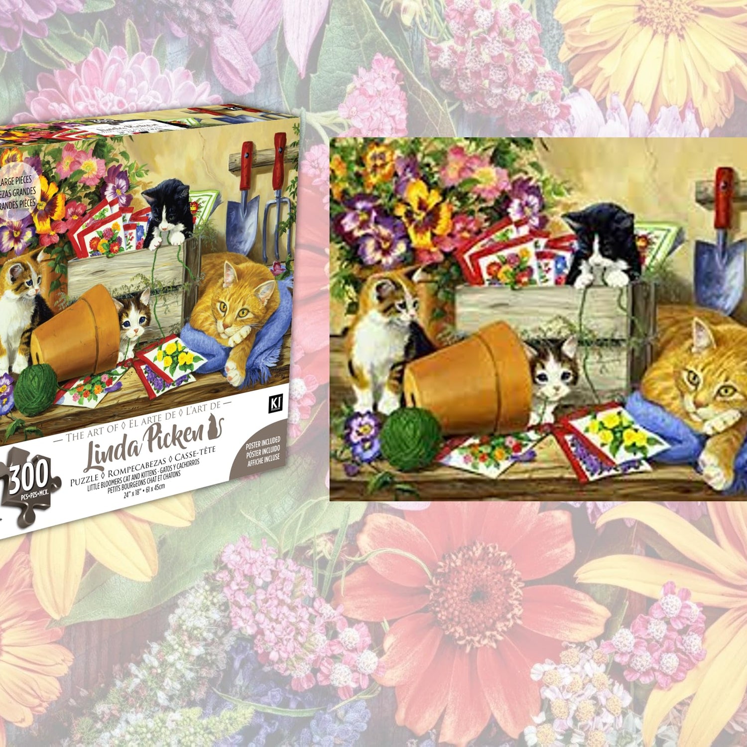 300 Piece Puzzle for Adults Linda Picken Little Bloomers Cat & Kittens 24 x 18 Cute Jigsaw by KI Puzzles