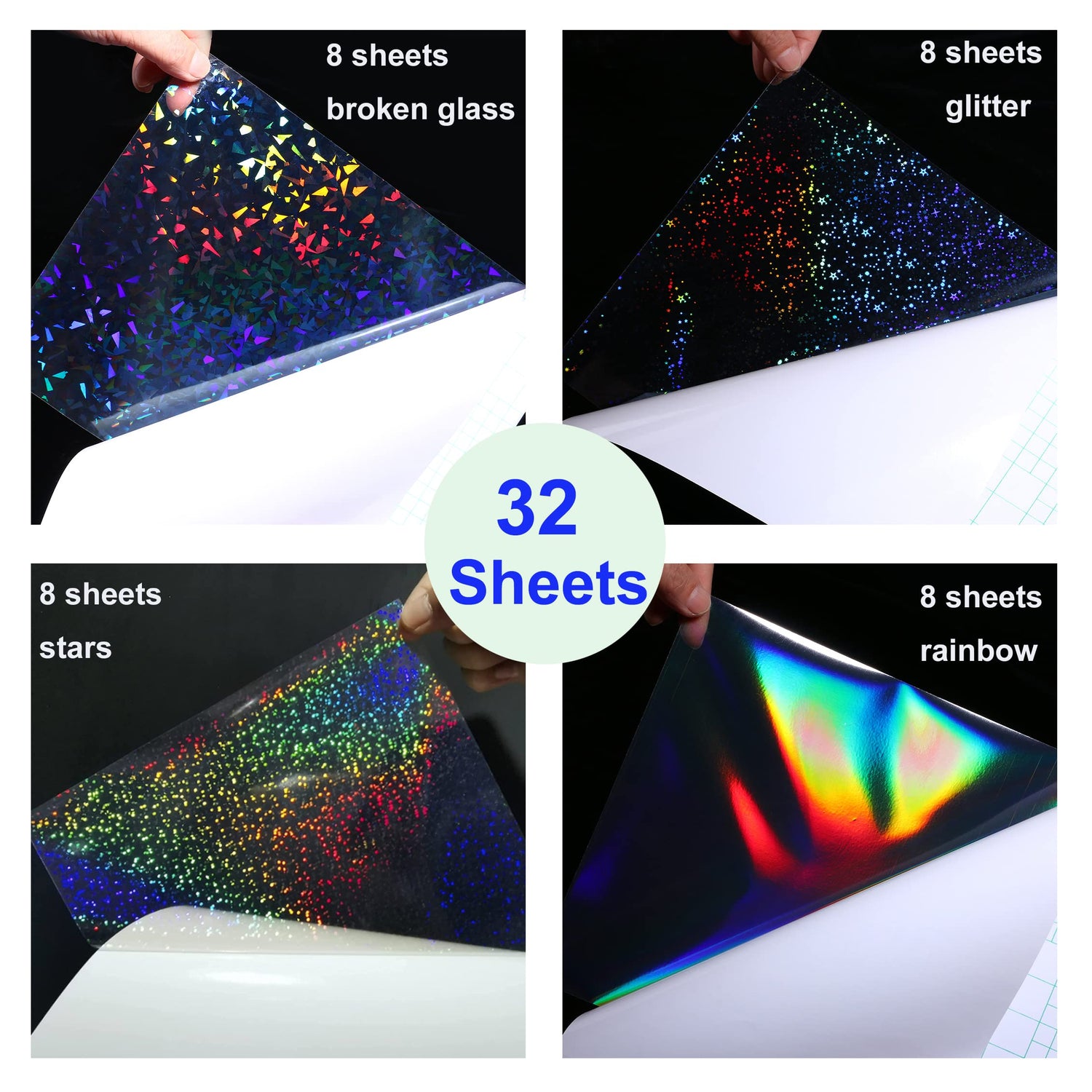 - 32 Sheets Holographic Sticker Paper A4 (11.7 x 8.3 Inch) Clear Vinyl Sticker Paper Self Adhesive Waterproof Transparent Overlay Film Holographic Overlay with 4 Styles Mixed.