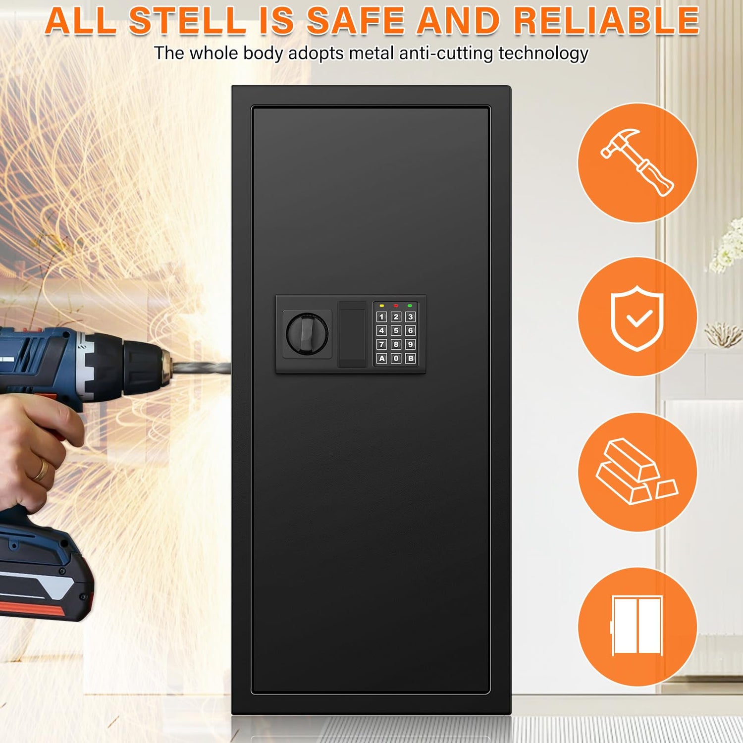 - Heavy Duty Steel Construction: This security safe is made of durable heavy duty steel with a powder coat and scratch resistant black finish. Two strong motorized deadbolt locking, can effectively resist the attack of hand or power tools