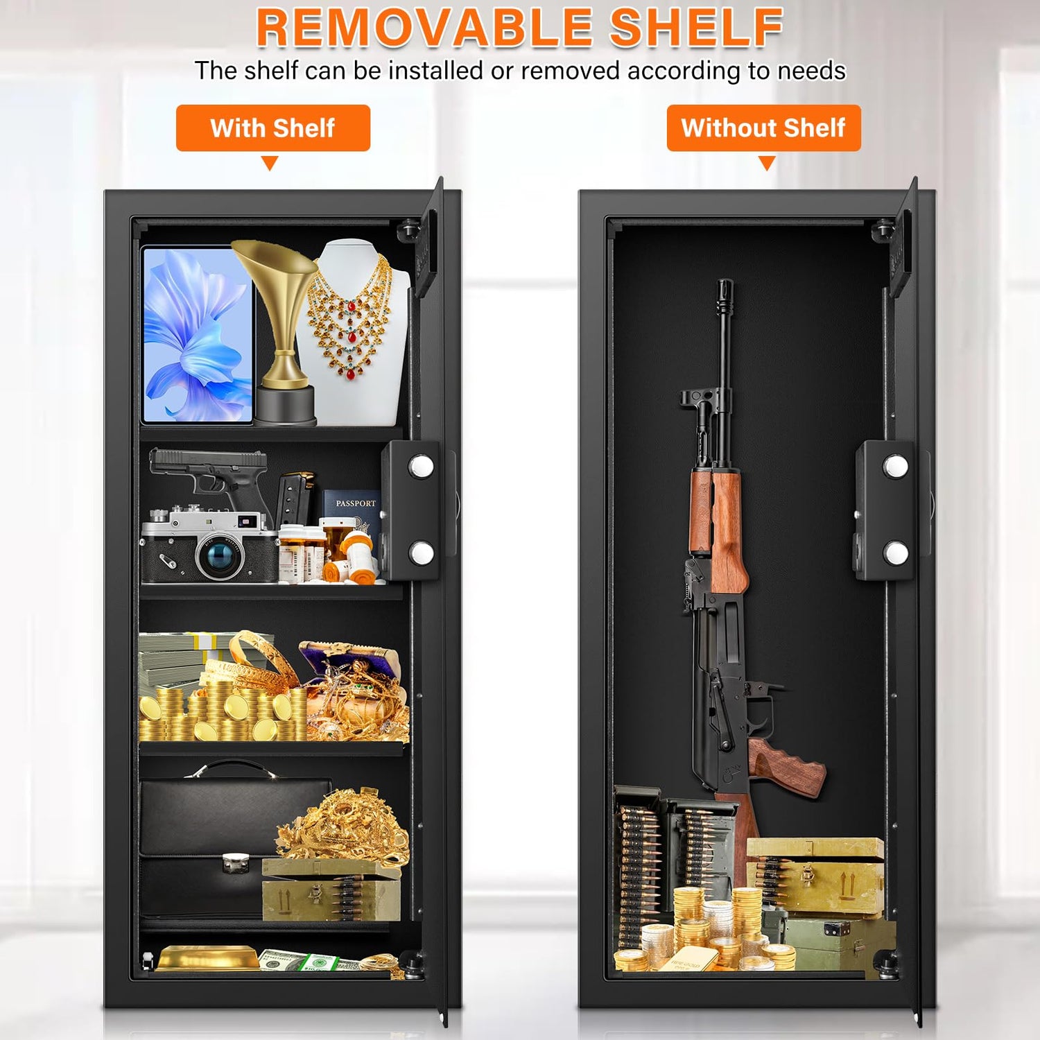 - Hidden Compartment: The "false bottom" gives you a secret safe compartment to provide additional security for items such as pistols, cash, jewelry. Additionally, it includes 3 removable shelves and key hooks. Appropriate inside apportion satisfies classified placement