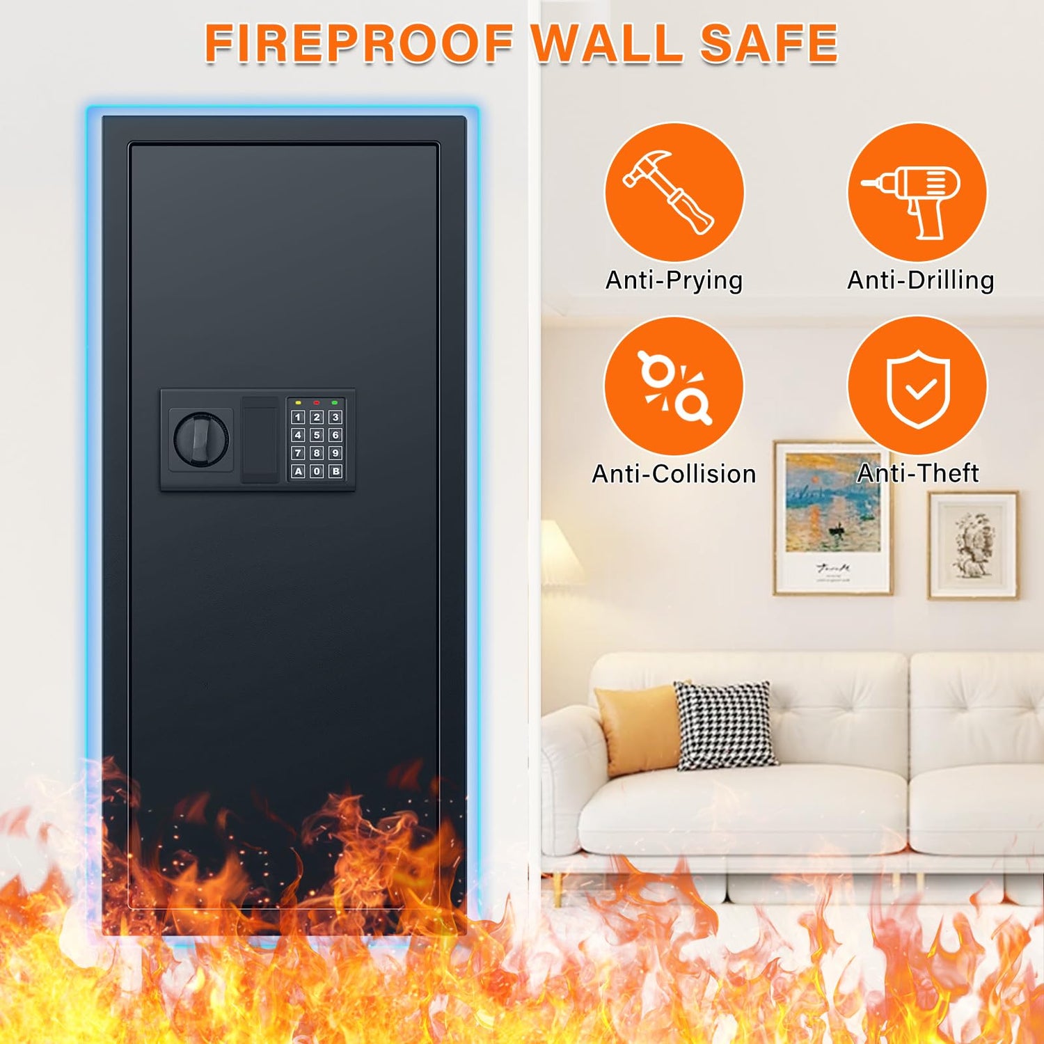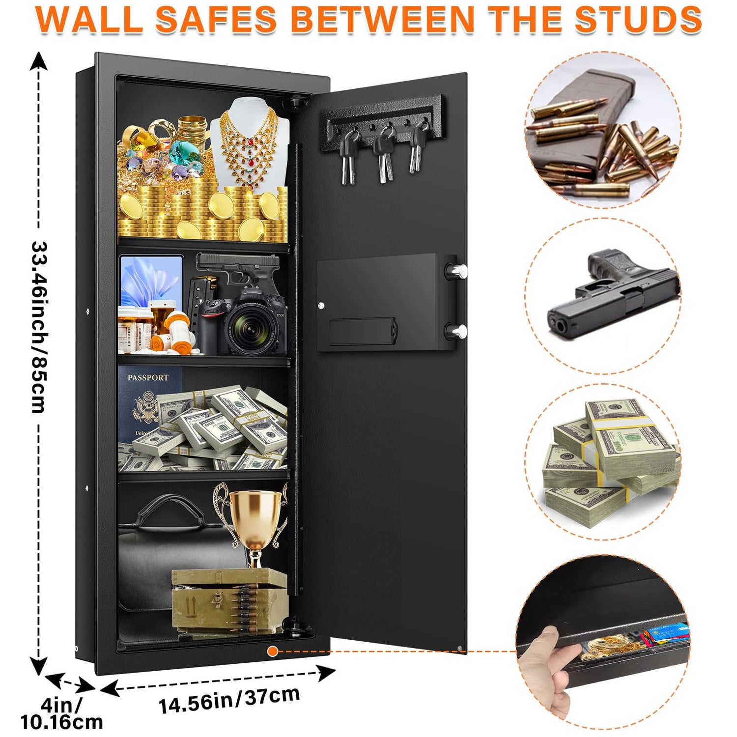 - Fireproof Wall Safe: Exterior Dimensions: 33.46"(H) x 3.93"(D) x 14.57"(W). Our wall safe fits very well between studs that are on 16” centers. The flush mount of the safe allows concealment on a wall behind framed artwork. It worked perfectly to keep something away from kids