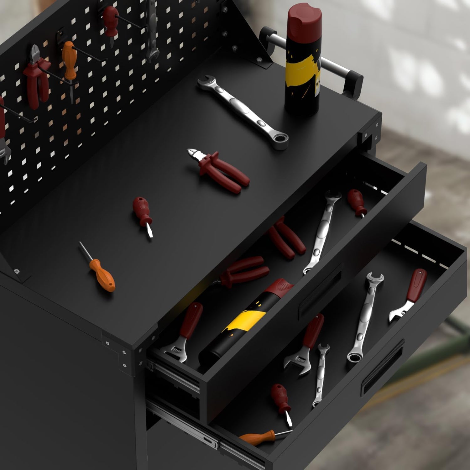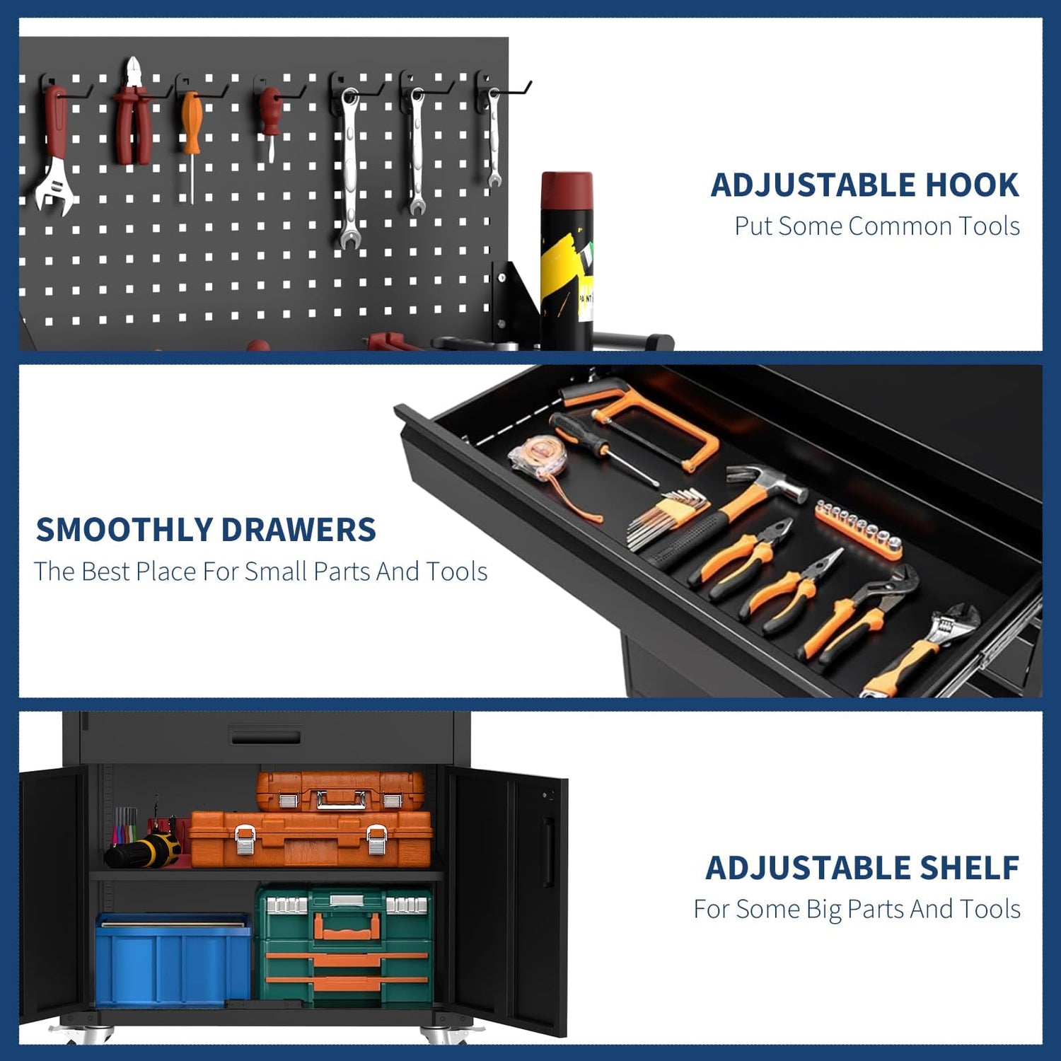 - Integrated Pegboard: A built-in pegboard keeps your most-used tools visible and accessible, freeing up valuable drawer and shelf space. Ideal for storing screwdrivers, wrenches, pliers, and more to reduce clutter and boost productivity.