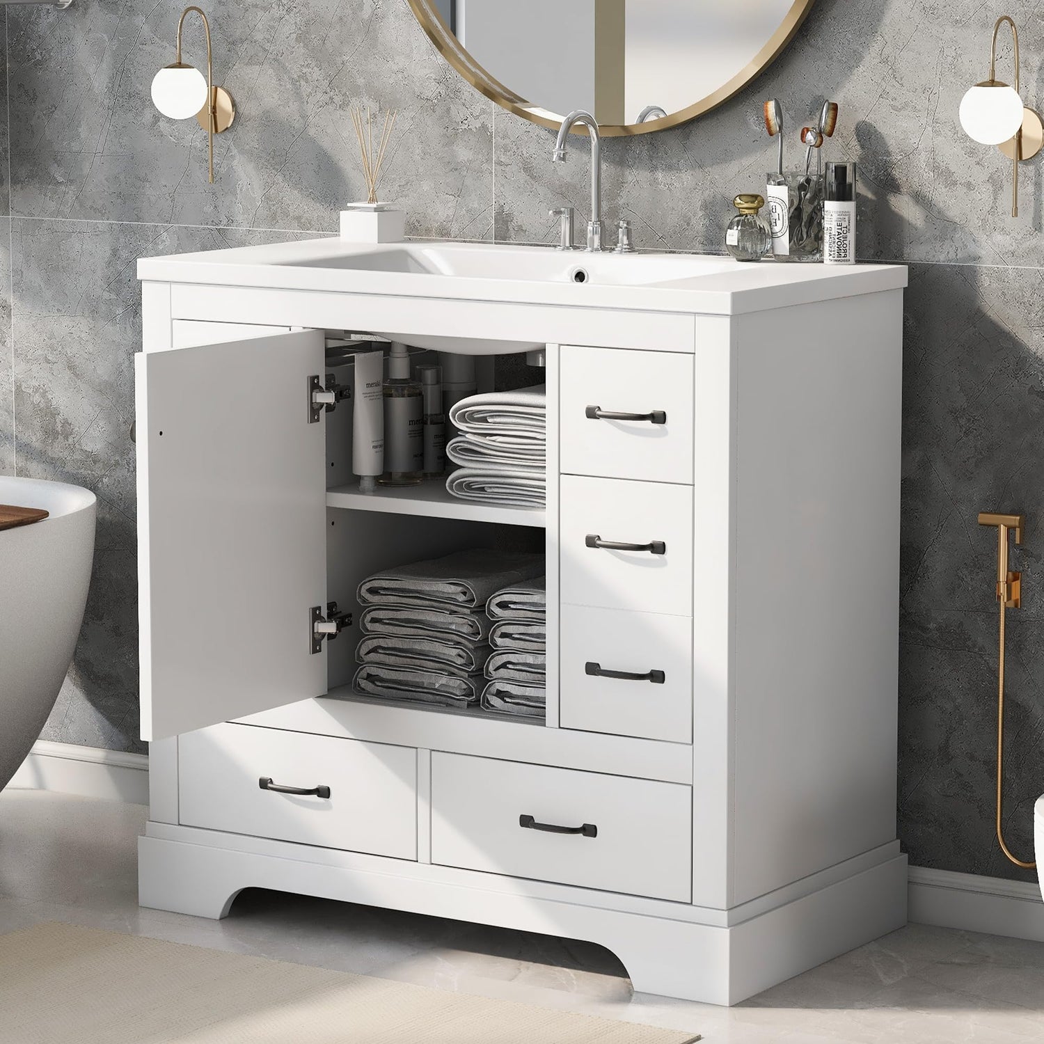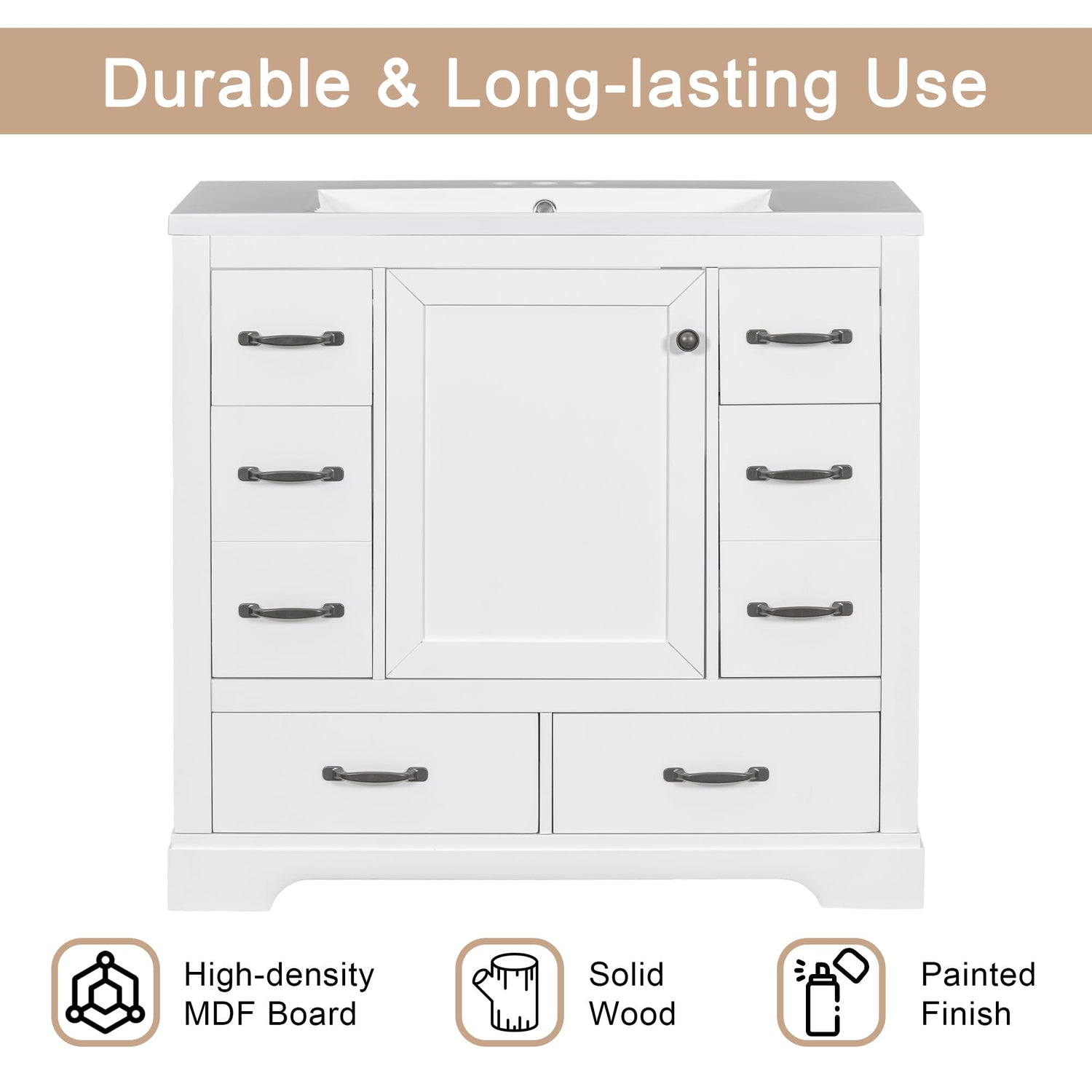 - 【Perfect Storage Solution for Bathroom】This bathroom vanity has ample enclosed storage spaces: one cabinet with an adjustable shelf inside, and 6 drawers in different sizes with slide rails on each side. You can put soaps, towels, shampoos, tissue paper, and other bathroom essentials in it to keep them away from dust.