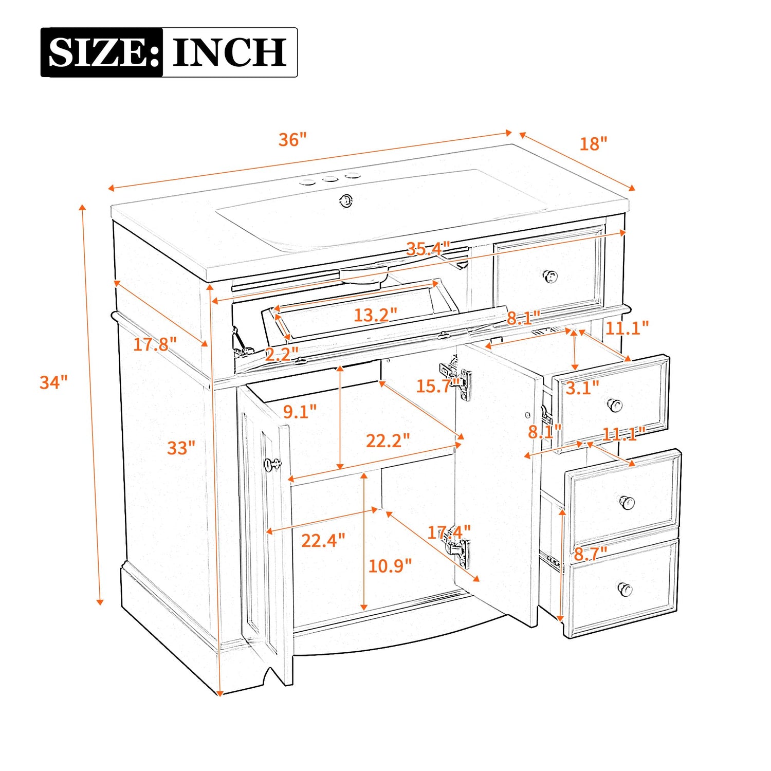 - [Bathroom Vanity 36 Inch with Resin Sink]: The bathroom basin sink is made of solid resin ceramic with durable and water-proof finish, easy to clean, which hardly leaves water stains. The pre-drilled 3 holes on the top is available to 4" center-set faucet (not included). Besides, there is a anti-spill hole to prevent water from overflowing when you forgot to turn off the tap.