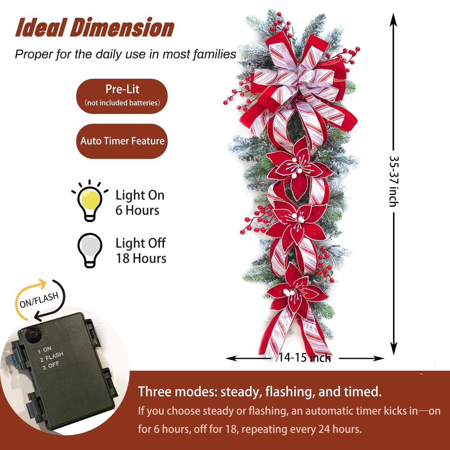 36 Inch Pre-Lit Christmas Teardrop Swag, Soomeir Winter Holiday Swags Wreaths with Red Velvet Glitter Stripe Ribbon, Red Berries for Front Door, Wall Window Fireplace Mailbox Artificial Decor