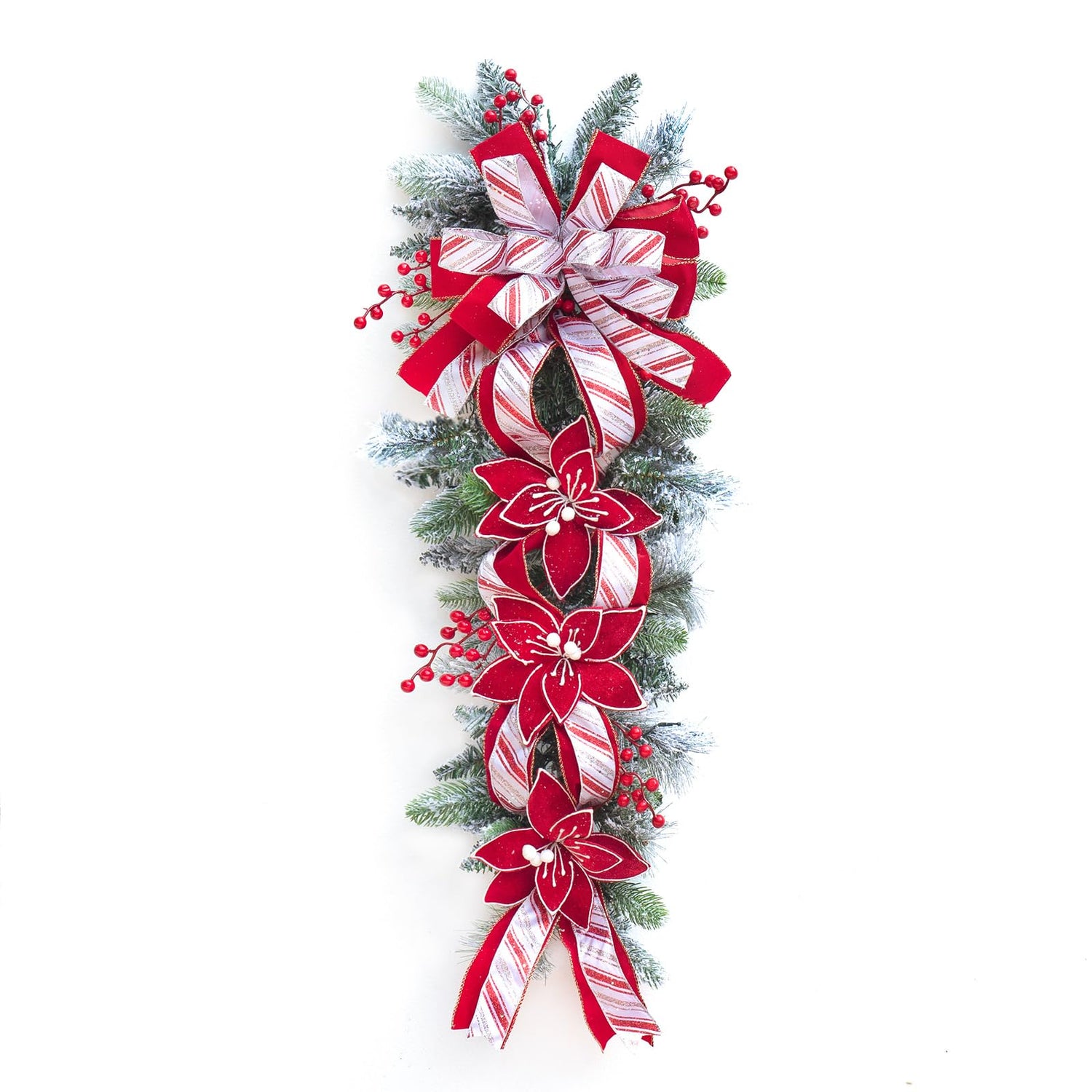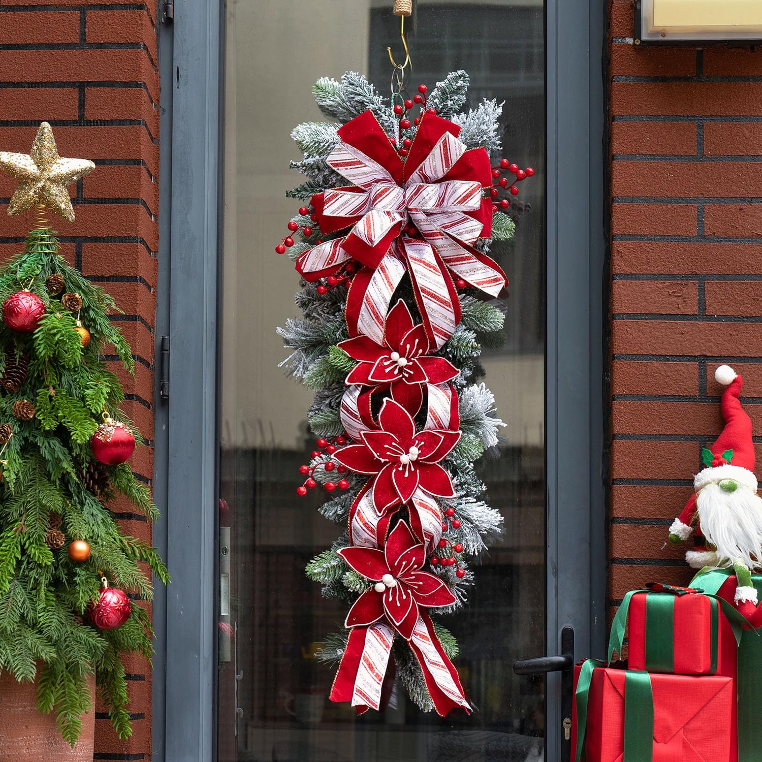 - 【Sparkling Holiday】Hey, check out the Soomeir Christmas Swag – it's got that classic red and white vibe going on. The top bow is rocking some fancy red and white stripes with red velvet, giving it that pop, you know? And those cleverly placed red Christmas flowers add a splash of vibrant color. The red berries? They just bring in a playful and cute touch to the whole festive setup. It's like, "Bam!" – instant holiday cheer. This swag is all about the bright and cozy Christmas feels!