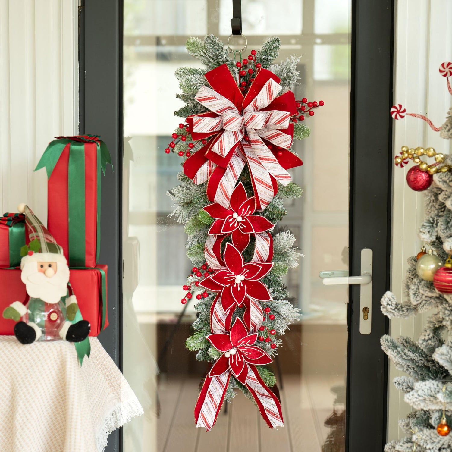 - 【Exllent Packaging】The packaging is a cherry on top. The ribbons and poinsettias of the Christmas Swag are adjustable, so even if it's been sitting in a box, you can tweak them back into place using our included gift card. To ensure safe transport and seasonal storage, the package includes a transparent bag and an exclusive Christmas gift box. It's the ultimate choice for gifting to friends and family, keeping your Christmas present looking fresh and vibrant.