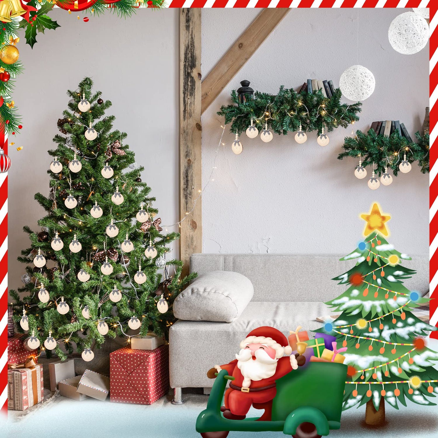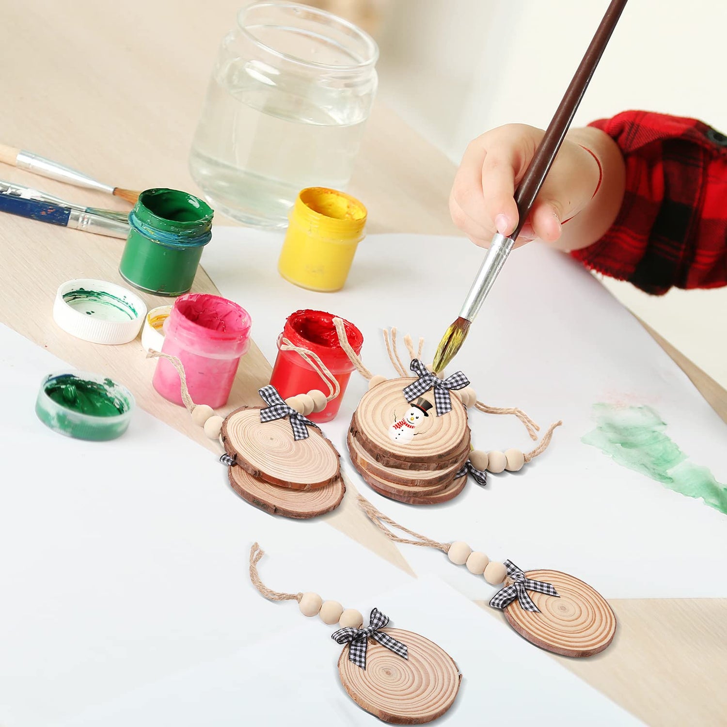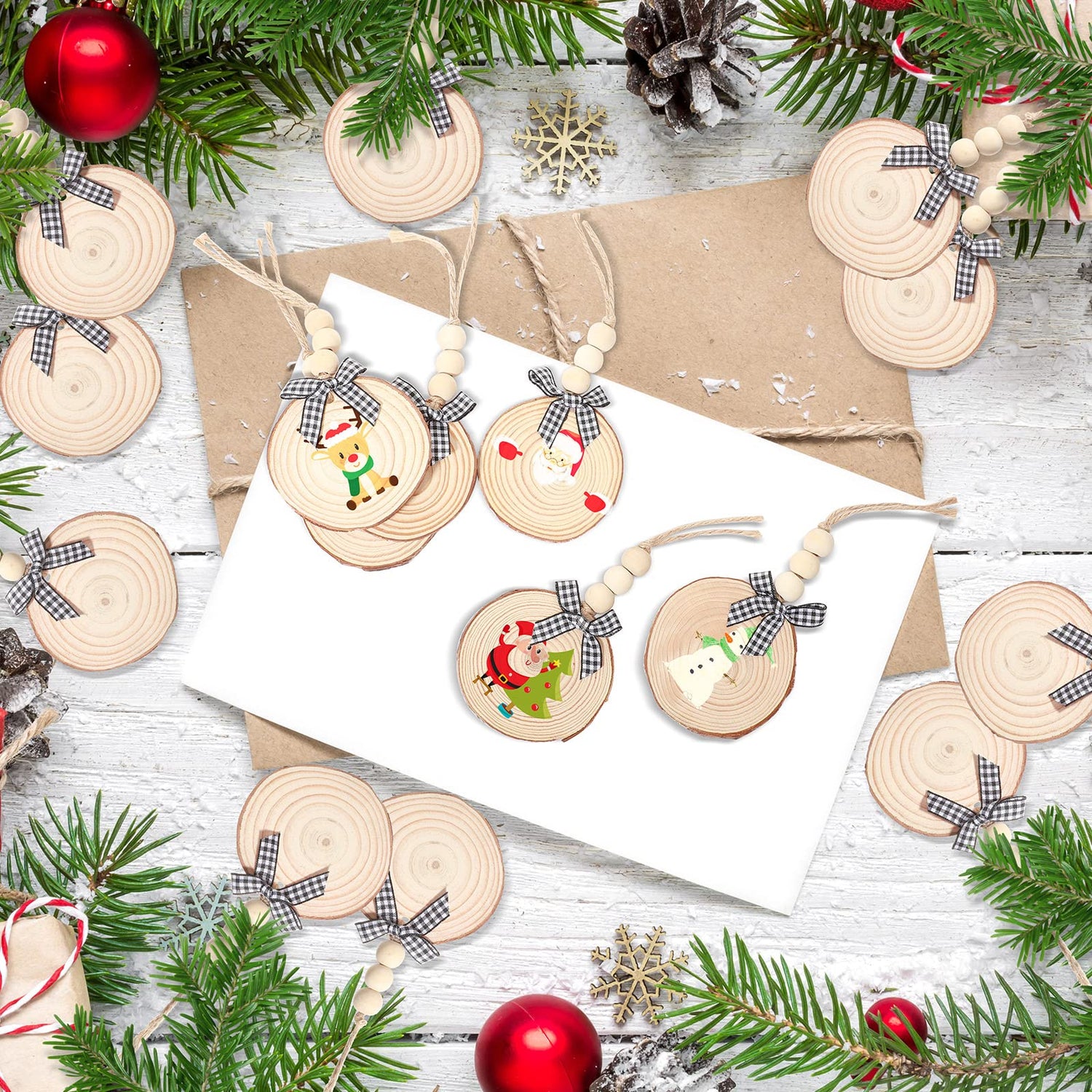 - Enough Quantity to Use and Replace: you will receive a set of 36 pieces of finished Christmas natural wood slices; Each wood slice comes with 3 natural round wood beads, 1 black and white checkered bow and 1 rope, to decorate the beautiful Christmas